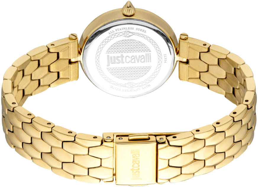 Элегантные женские часы Just Cavalli Donna JC1L254M0055 с минеральным стекломМинеральное стеклоМинеральное стекло представляет собой искусственно выращенный минерал кварца. Такое стекло отличается особой устойчивостью к повреждениям и царапинам. Уступает по некоторым качествам сапфировому стеклу., кварцевый механизм с высокой точностью. Циферблат украшен кристаллами. Корпус и браслет часов изготовлен из стали с PVD-покрытиемPVDУльтратонкое покрытие наносится в технике вакуумного напыления, сочетает в себе нитрид титана особой прочности со слоем золота или оксида хрома. Несёт в себе декоративную или защитную функцию.. Класс водозащиты: 50 метров, позволит защитить корпус от случайных брызг или капель дождя.