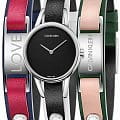Модель поставляется в комплекте с цветными кожаными ремешками, кнопки позволяют менять его по желанию. Неиспользуемые элементы можно носить как отдельный браслет. Швейцарский кварцевый калибр ETA F05.101 отвечает за высокую точность хода. Минеральное стекло отличается надёжностью, устойчивостью к царапинам.
