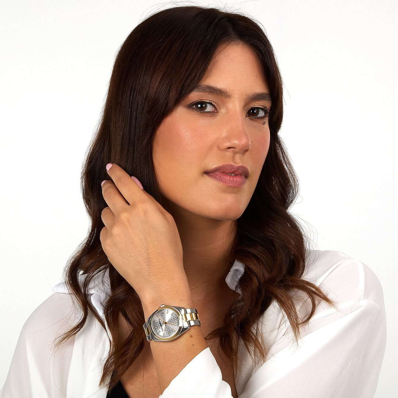 Женские элегантные часы Karl Lagerfeld Round Essentials R0553101507, кварцевый механизм с высокой точностью. Минеральное стеклоМинеральное стеклоМинеральное стекло представляет собой искусственно выращенный минерал кварца. Такое стекло отличается особой устойчивостью к повреждениям и царапинам. Уступает по некоторым качествам сапфировому стеклу. устойчивое к появлению царапин, обладающее высокой прозрачностью. Изысканный корпус изготовлен из нержавеющей стали с неподвижным безелемБезельВнешний ободок, закрепляющий стекло. В спортивных часах так называется поворотное кольцо с делениями на циферблате, выполняет роль таймера – замеряет отрезки времени на шкале. Неподвижный безель – элемент декора. Однонаправленно вращающийся безель на дайверских часах позволяет фиксировать моменты погружения и выныривания на поверхность. с IP-покрытиемIP-покрытиеМетод ионного напыления. Демонстрирует повышенную устойчивость к истиранию, окислению и химическим веществам. Под воздействием высокого давления и температуры около 1500°C молекулы металла надёжно соединяются с частицами корпуса часов.. Лаконичные центральные часовая, минутная и секундная стрелки. Водонепроницаемость 5 АТМ позволяет использовать часы в повседневных условиях — при мытье рук или под лёгким дождём. Стальной браслет с частичным IP-покрытиемIP-покрытиеМетод ионного напыления. Демонстрирует повышенную устойчивость к истиранию, окислению и химическим веществам. Под воздействием высокого давления и температуры около 1500°C молекулы металла надёжно соединяются с частицами корпуса часов. c раскладной застёжкойРаскладная застёжкаТакой тип застёжки используется только на браслетах из металла. Она никогда не раскрывается полностью, происходит разделение на 2 и более частей. Раскладывающая застёжка снизит вероятность потери часов к минимуму., обеспечивающей комфорт и уверенную фиксацию на запястье, а также добавляя завершающий штрих к этому стильному аксессуару. Стрелки и метки оснащены люминесцентным покрытиемЛюминесцентное покрытиеПозволяет считывать показания времени в темноте. Производители наносят на стрелки, часовые индексы, безель или поверхность циферблата светонакопительный состав, дающий холодное свечение., обеспечивающим хорошую читаемость в темноте. Циферблат подчёркивает изысканный характер часов, создавая универсальный образ, подходящий как для повседневных ситуаций, так и для особых случаев. Аккуратное окошко даты на отметке «3 часов».