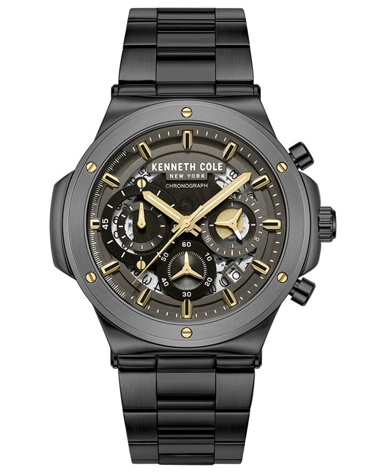 Мужские кварцевые часы Kenneth Cole KCWGI0047303 — это выразительный аксессуар с мощным характером. Корпус диаметром 45 мм выполнен из стали с IP-покрытиемIP-покрытиеМетод ионного напыления. Демонстрирует повышенную устойчивость к истиранию, окислению и химическим веществам. Под воздействием высокого давления и температуры около 1500°C молекулы металла надёжно соединяются с частицами корпуса часов. чёрного цвета. Циферблат чёрного цвета оформлен метками в виде штрихов и дополнен функциями хронографаХронографФункция позволяет измерять отрезки времени с особой точностью: часы, минуты, секунды. Верным признаком хронографа является наличие на циферблате 3 дополнительных окошек-счётчиков. и индикации даты. Стрелки и метки оснащены люминесцентным покрытиемЛюминесцентное покрытиеПозволяет считывать показания времени в темноте. Производители наносят на стрелки, часовые индексы, безель или поверхность циферблата светонакопительный состав, дающий холодное свечение., обеспечивающим хорошую читаемость в темноте. Циферблат защищён минеральным стекломМинеральное стеклоМинеральное стекло представляет собой искусственно выращенный минерал кварца. Такое стекло отличается особой устойчивостью к повреждениям и царапинам. Уступает по некоторым качествам сапфировому стеклу.. Часы оснащены стальным браслетом с IP-покрытиемIP-покрытиеМетод ионного напыления. Демонстрирует повышенную устойчивость к истиранию, окислению и химическим веществам. Под воздействием высокого давления и температуры около 1500°C молекулы металла надёжно соединяются с частицами корпуса часов. на раскладной застёжкеРаскладная застёжкаТакой тип застёжки используется только на браслетах из металла. Она никогда не раскрывается полностью, происходит разделение на 2 и более частей. Раскладывающая застёжка снизит вероятность потери часов к минимуму.. Водонепроницаемость 30 м позволяет использовать часы в повседневных условиях, защищая от случайных брызг и капель дождя. Уверенный выбор для тех, кто предпочитает крупные детали и современный стиль.