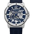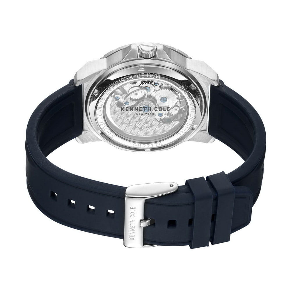 Мужские механические часы-скелетоны с минеральным стекломМинеральное стеклоМинеральное стекло представляет собой искусственно выращенный минерал кварца. Такое стекло отличается особой устойчивостью к повреждениям и царапинам. Уступает по некоторым качествам сапфировому стеклу. Kenneth Cole Automatic KCWGR2217402, механический механизм (автоматический калибр) с высокой точностью. Класс водозащиты: 30 метров, позволит защитить корпус от случайных брызг или капель дождя. Корпус часов изготовлен из стали. Синий каучуковый ремешок на стандартной застёжке. Стрелки и метки с люминесцентным покрытиемЛюминесцентное покрытиеПозволяет считывать показания времени в темноте. Производители наносят на стрелки, часовые индексы, безель или поверхность циферблата светонакопительный состав, дающий холодное свечение..
