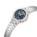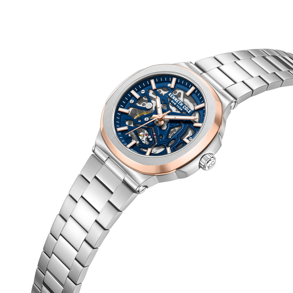 Мужские механические часы с автоподзаводом Kenneth Cole KCWGY0046201 — это выразительный аксессуар, сочетающий современный дизайн и инженерную изысканность. Корпус размером 44 мм выполнен из нержавеющей стали. Безель с частичным IP-покрытиемIP-покрытиеМетод ионного напыления. Демонстрирует повышенную устойчивость к истиранию, окислению и химическим веществам. Под воздействием высокого давления и температуры около 1500°C молекулы металла надёжно соединяются с частицами корпуса часов. розового золота и стального цвета. Циферблат синего цвета частично скелетонизирован, что позволяет наблюдать за работой механизма, добавляя модели динамики и технологичности. Циферблат защищён минеральным стекломМинеральное стеклоМинеральное стекло представляет собой искусственно выращенный минерал кварца. Такое стекло отличается особой устойчивостью к повреждениям и царапинам. Уступает по некоторым качествам сапфировому стеклу. и оформлен метками в виде штрихов. Стрелки и метки оснащены люминесцентным покрытиемЛюминесцентное покрытиеПозволяет считывать показания времени в темноте. Производители наносят на стрелки, часовые индексы, безель или поверхность циферблата светонакопительный состав, дающий холодное свечение., обеспечивающим хорошую читаемость в темноте. Часы оснащены стальным браслетом с раскладной застёжкойРаскладная застёжкаТакой тип застёжки используется только на браслетах из металла. Она никогда не раскрывается полностью, происходит разделение на 2 и более частей. Раскладывающая застёжка снизит вероятность потери часов к минимуму.. Водонепроницаемость 30 м позволяет использовать часы в повседневных условиях, защищая от случайных брызг и капель дождя. Сочетание строгого стиля и детального исполнения делает эти часы заметным элементом образа.