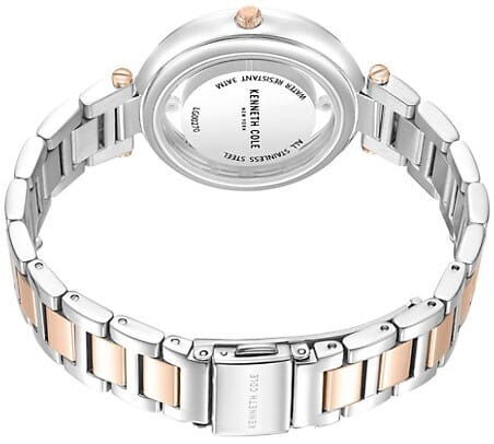 Женские кварцевые часы с минеральным стекломМинеральное стеклоМинеральное стекло представляет собой искусственно выращенный минерал кварца. Такое стекло отличается особой устойчивостью к повреждениям и царапинам. Уступает по некоторым качествам сапфировому стеклу. Kenneth Cole New York KCWLG0027001, кварцевый механизм с высокой точностью. Класс водозащиты: 30 метров, позволит защитить корпус от случайных брызг или капель дождя. Корпус часов изготовлен из стали. Стальной браслет на раскладной застёжкеРаскладная застёжкаТакой тип застёжки используется только на браслетах из металла. Она никогда не раскрывается полностью, происходит разделение на 2 и более частей. Раскладывающая застёжка снизит вероятность потери часов к минимуму. с PVD-покрытиемPVDУльтратонкое покрытие наносится в технике вакуумного напыления, сочетает в себе нитрид титана особой прочности со слоем золота или оксида хрома. Несёт в себе декоративную или защитную функцию.. Циферблат инкрустирован кристаллами.