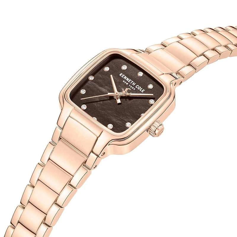 Женские кварцевые часы Kenneth Cole — это элегантный и выразительный аксессуар. Корпус размером 28 мм выполнен из нержавеющей стали 316L с IP-покрытиемIP-покрытиеМетод ионного напыления. Демонстрирует повышенную устойчивость к истиранию, окислению и химическим веществам. Под воздействием высокого давления и температуры около 1500°C молекулы металла надёжно соединяются с частицами корпуса часов. цвета розового золота. Циферблат коричневого цвета оформлен индексами и украшен цирконами. Циферблат защищён минеральным стекломМинеральное стеклоМинеральное стекло представляет собой искусственно выращенный минерал кварца. Такое стекло отличается особой устойчивостью к повреждениям и царапинам. Уступает по некоторым качествам сапфировому стеклу.. Часы оснащены стальным браслетом с IP-покрытиемIP-покрытиеМетод ионного напыления. Демонстрирует повышенную устойчивость к истиранию, окислению и химическим веществам. Под воздействием высокого давления и температуры около 1500°C молекулы металла надёжно соединяются с частицами корпуса часов. на раскладной застёжкеРаскладная застёжкаТакой тип застёжки используется только на браслетах из металла. Она никогда не раскрывается полностью, происходит разделение на 2 и более частей. Раскладывающая застёжка снизит вероятность потери часов к минимуму.. Водонепроницаемость 30 м позволяет использовать часы в повседневных условиях. Идеальный выбор для тех, кто ценит стиль, блеск и американское качество.