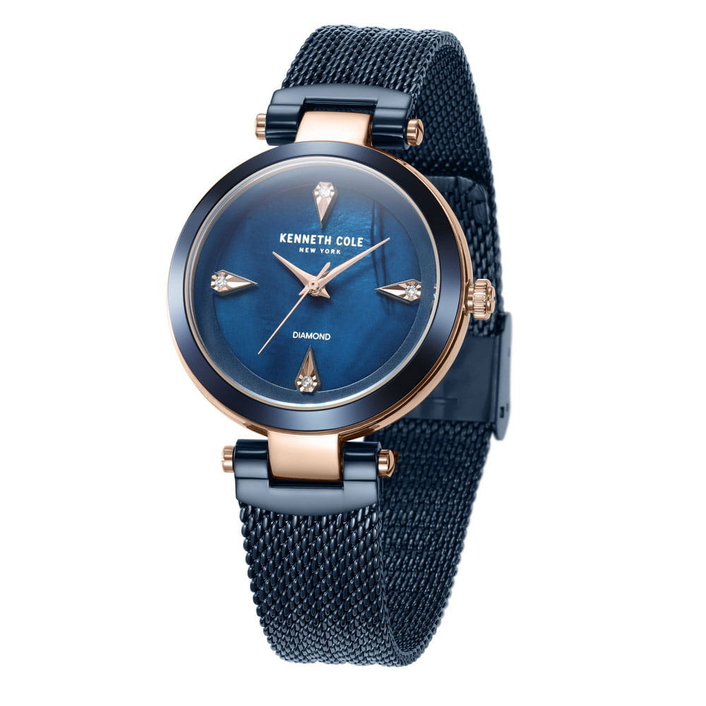 Женские кварцевые часы с минеральным стекломМинеральное стеклоМинеральное стекло представляет собой искусственно выращенный минерал кварца. Такое стекло отличается особой устойчивостью к повреждениям и царапинам. Уступает по некоторым качествам сапфировому стеклу. Kenneth Cole Classic KCWLG2236302, кварцевый механизм с высокой точностью. Класс водозащиты: 30 метров, позволит защитить корпус от случайных брызг или капель дождя. Корпус часов изготовлен из стали с IP-покрытиемIP-покрытиеМетод ионного напыления. Демонстрирует повышенную устойчивость к истиранию, окислению и химическим веществам. Под воздействием высокого давления и температуры около 1500°C молекулы металла надёжно соединяются с частицами корпуса часов.. Стальной браслет выполнен в технике миланского плетения на раскладной застёжкеРаскладная застёжкаТакой тип застёжки используется только на браслетах из металла. Она никогда не раскрывается полностью, происходит разделение на 2 и более частей. Раскладывающая застёжка снизит вероятность потери часов к минимуму. с IP-покрытиемIP-покрытиеМетод ионного напыления. Демонстрирует повышенную устойчивость к истиранию, окислению и химическим веществам. Под воздействием высокого давления и температуры около 1500°C молекулы металла надёжно соединяются с частицами корпуса часов.. БезельБезельВнешний ободок, закрепляющий стекло. В спортивных часах так называется поворотное кольцо с делениями на циферблате, выполняет роль таймера – замеряет отрезки времени на шкале. Неподвижный безель – элемент декора. Однонаправленно вращающийся безель на дайверских часах позволяет фиксировать моменты погружения и выныривания на поверхность. с IP-покрытиемIP-покрытиеМетод ионного напыления. Демонстрирует повышенную устойчивость к истиранию, окислению и химическим веществам. Под воздействием высокого давления и температуры около 1500°C молекулы металла надёжно соединяются с частицами корпуса часов.. Центральные часовая, минутная и секундная стрелки. Синий перламутровый циферблат украшен бриллиантами.