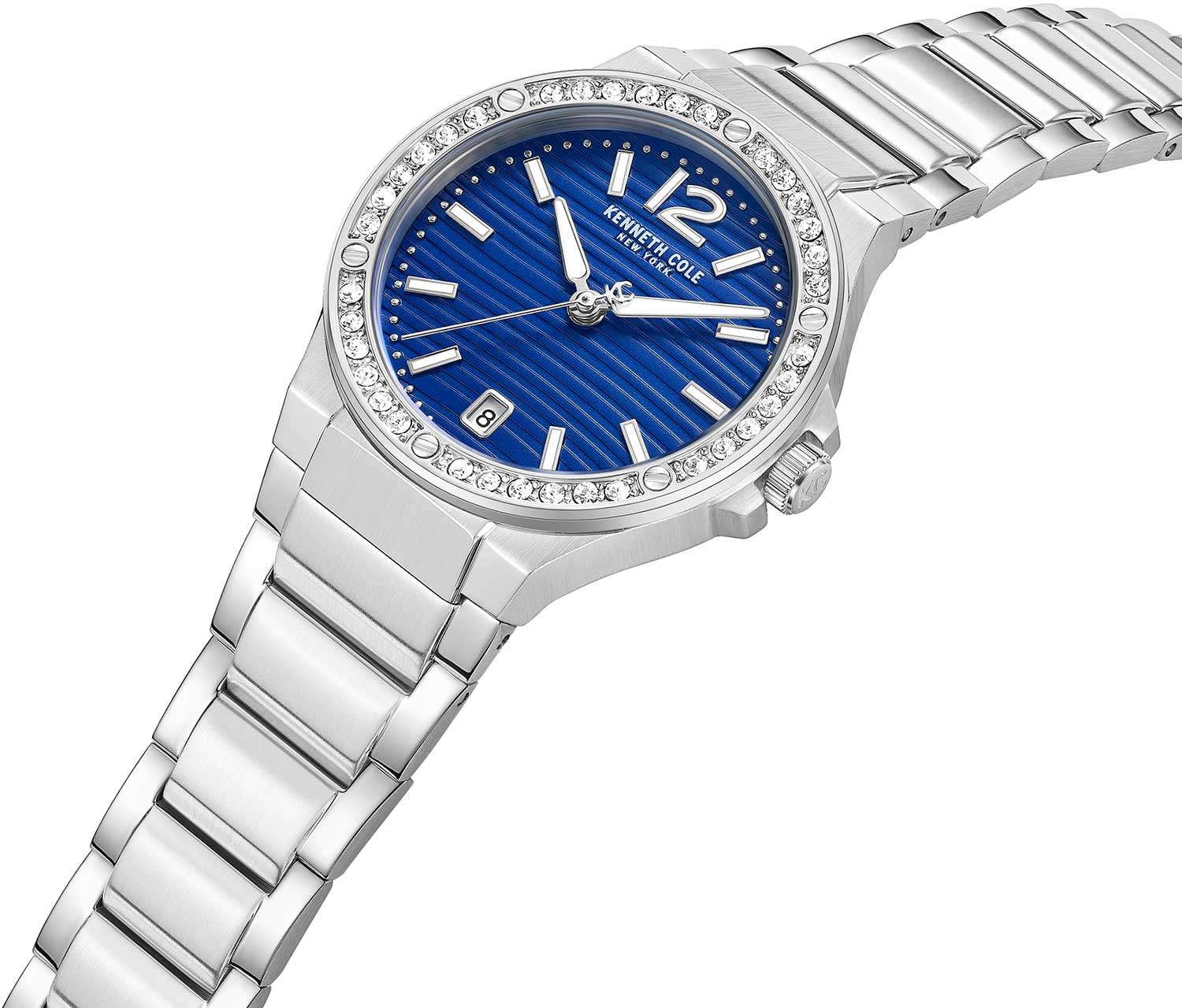 Женские кварцевые часы Kenneth Cole — это элегантный и выразительный аксессуар. Корпус диаметром 32 мм выполнен из нержавеющей стали 316L. Циферблат синего цвета оформлен штрихами, арабской цифрой 12 и украшен цирконами. БезельБезельВнешний ободок, закрепляющий стекло. В спортивных часах так называется поворотное кольцо с делениями на циферблате, выполняет роль таймера – замеряет отрезки времени на шкале. Неподвижный безель – элемент декора. Однонаправленно вращающийся безель на дайверских часах позволяет фиксировать моменты погружения и выныривания на поверхность. инкрустирован кристаллами. Окошко даты расположено в положении 6 часов. Циферблат защищён минеральным стекломМинеральное стеклоМинеральное стекло представляет собой искусственно выращенный минерал кварца. Такое стекло отличается особой устойчивостью к повреждениям и царапинам. Уступает по некоторым качествам сапфировому стеклу. с антибликовым покрытиемАнтибликовое покрытиеСлой оксида металла в 0,13-0,3 микрон, благодаря которому стекло часов не бликует и не отражает свет. Антибликовое покрытие уменьшает отражение света в 10 раз, обеспечивая отличную читаемость показателей циферблата.. Механизм — кварцевый калибр TMI VX32. Часы оснащены стальным браслетом на раскладной застёжкеРаскладная застёжкаТакой тип застёжки используется только на браслетах из металла. Она никогда не раскрывается полностью, происходит разделение на 2 и более частей. Раскладывающая застёжка снизит вероятность потери часов к минимуму.. Водонепроницаемость 30 м позволяет использовать часы в повседневных условиях. Идеальный выбор для тех, кто ценит стиль, блеск и американское качество.