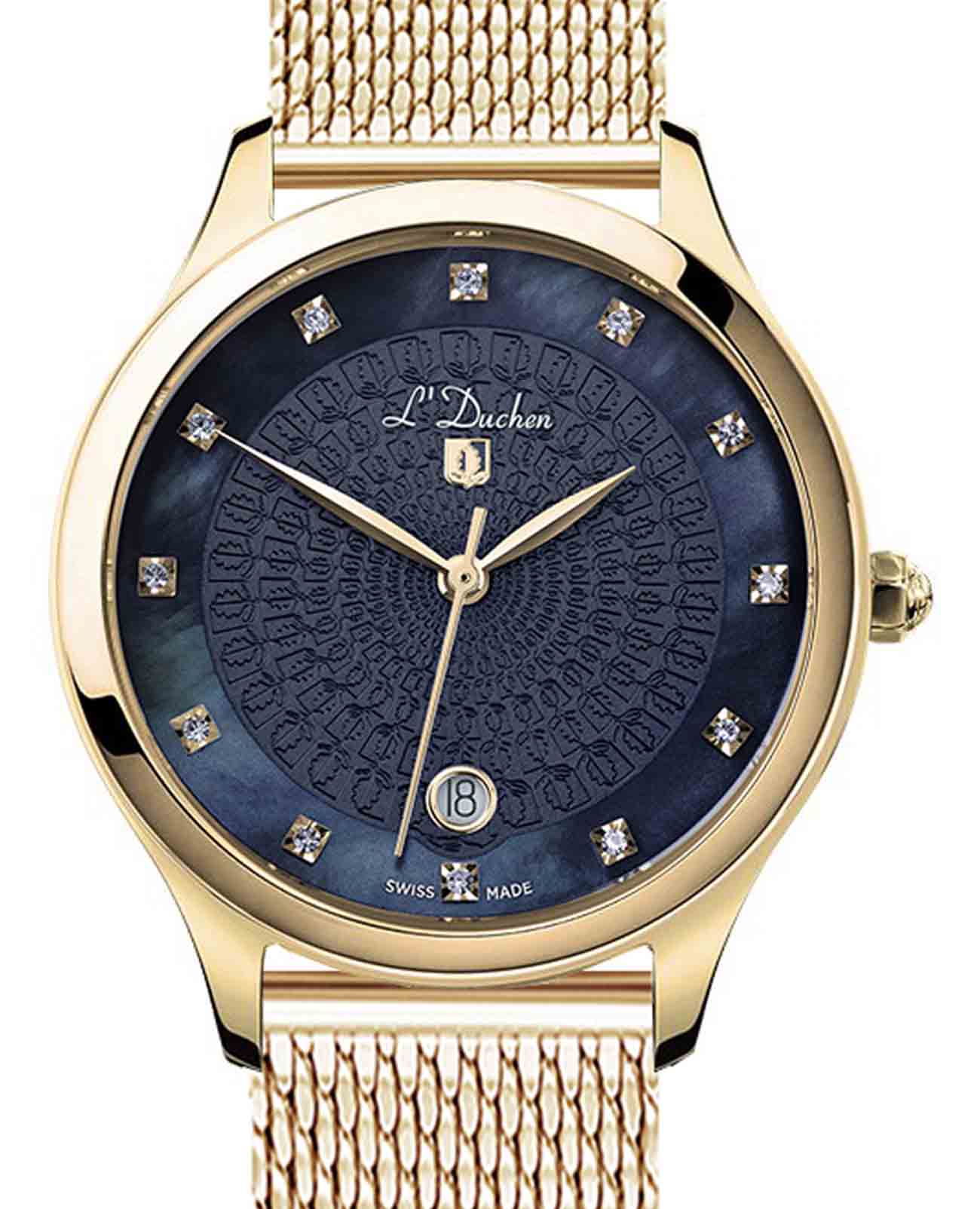 Женские швейцарские часы L'Duchen Grace D 791.23.37 M, кварцевый механизм с высокой точностью. Сапфировое стеклоСапфировое стеклоПрочный и надёжный материал из кристалла сапфира синтетического происхождения, характеризующийся особой твёрдостью и устойчивостью к царапинам и повреждениям. устойчивое к появлению царапин, обладающее высокой прозрачностью. Корпус часов выполнен из нержавеющей стали. Окошко даты находится в положении 6 часов. Класс водозащиты: 50 метров, позволит защитить корпус от случайных брызг или капель дождя. Стальной браслет миланского плетения с PVD-покрытиемPVDУльтратонкое покрытие наносится в технике вакуумного напыления, сочетает в себе нитрид титана особой прочности со слоем золота или оксида хрома. Несёт в себе декоративную или защитную функцию. на раскладном замкеРаскладной замокДанный вариант застежки используется только на часах с металлическим браслетом. Отличительная особенность такого крепления в том, что длина браслета становится универсальной и вы можете самостоятельно отрегулировать нужный вам размер – застежка просто двигается по браслету часов..