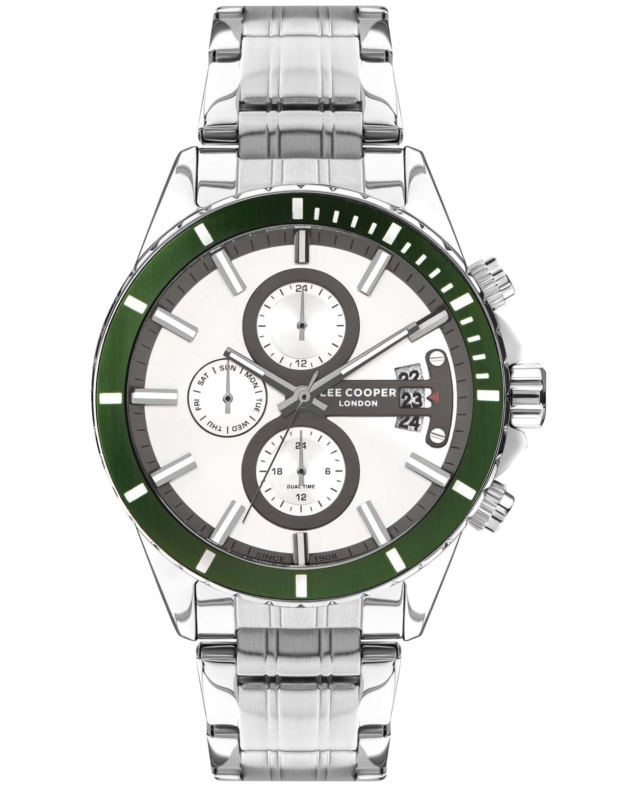 Мужские часы Lee Cooper LC07529.330 — это стильное сочетание элегантности и современного дизайна. Круглый корпус диаметром 44 мм выполнен из суперметалла серебристого цвета. БезельБезельВнешний ободок, закрепляющий стекло. В спортивных часах так называется поворотное кольцо с делениями на циферблате, выполняет роль таймера – замеряет отрезки времени на шкале. Неподвижный безель – элемент декора. Однонаправленно вращающийся безель на дайверских часах позволяет фиксировать моменты погружения и выныривания на поверхность. с IP-покрытиемIP-покрытиеМетод ионного напыления. Демонстрирует повышенную устойчивость к истиранию, окислению и химическим веществам. Под воздействием высокого давления и температуры около 1500°C молекулы металла надёжно соединяются с частицами корпуса часов. зеленого цвета придает модели особый вид. Циферблат защищен минеральным стекломМинеральное стеклоМинеральное стекло представляет собой искусственно выращенный минерал кварца. Такое стекло отличается особой устойчивостью к повреждениям и царапинам. Уступает по некоторым качествам сапфировому стеклу., обеспечивающим устойчивость к царапинам. Метки в виде штрихов. Часы оснащены надежным кварцевым механизмом, а металлический браслет на раскладной застёжкеРаскладная застёжкаТакой тип застёжки используется только на браслетах из металла. Она никогда не раскрывается полностью, происходит разделение на 2 и более частей. Раскладывающая застёжка снизит вероятность потери часов к минимуму. гарантирует комфортную посадку на запястье. Окошко даты находится в положении 3 часа. Стрелки и метки с люминесцентным покрытиемЛюминесцентное покрытиеПозволяет считывать показания времени в темноте. Производители наносят на стрелки, часовые индексы, безель или поверхность циферблата светонакопительный состав, дающий холодное свечение. позволяют легко считывать время даже в условиях недостаточного освещения. Мультифункциональная модель с индикацией даты, дня недели, с дополнительным 24-х часовым индикатором. Водозащита 50 метров позволит защитить корпус от случайных брызг или капель дождя. Lee Cooper — отличный выбор для тех, кто ценит утонченность и качество.