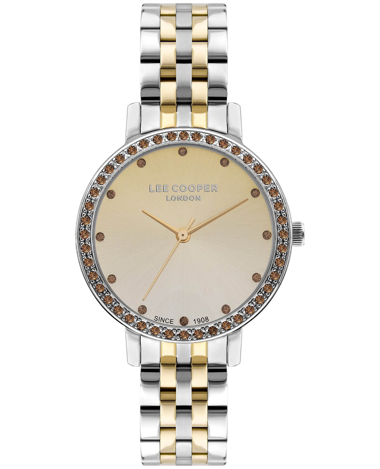 Женские часы Lee Cooper LC07590.210 — это стильное сочетание элегантности и современного дизайна. Круглый корпус диаметром 34 мм выполнен из суперметалла серебристого цвета. Неподвижный безельБезельВнешний ободок, закрепляющий стекло. В спортивных часах так называется поворотное кольцо с делениями на циферблате, выполняет роль таймера – замеряет отрезки времени на шкале. Неподвижный безель – элемент декора. Однонаправленно вращающийся безель на дайверских часах позволяет фиксировать моменты погружения и выныривания на поверхность. инкрустирован цирконами, что придает модели особый блеск. Градиентный циферблат с минималистичными метками в виде точек придает часам элегантность и утонченность, делая их идеальным аксессуаром для любой женщины, а минеральное стеклоМинеральное стеклоМинеральное стекло представляет собой искусственно выращенный минерал кварца. Такое стекло отличается особой устойчивостью к повреждениям и царапинам. Уступает по некоторым качествам сапфировому стеклу., обеспечивает устойчивость к царапинам. Центральные часовая, минутная и секундная стрелки. Часы оснащены надежным кварцевым механизмом, источник питания - батарейка. Металлический браслет с частичным IP-покрытиемIP-покрытиеМетод ионного напыления. Демонстрирует повышенную устойчивость к истиранию, окислению и химическим веществам. Под воздействием высокого давления и температуры около 1500°C молекулы металла надёжно соединяются с частицами корпуса часов. на раскладной застёжкеРаскладная застёжкаТакой тип застёжки используется только на браслетах из металла. Она никогда не раскрывается полностью, происходит разделение на 2 и более частей. Раскладывающая застёжка снизит вероятность потери часов к минимуму. гарантирует комфортную посадку на запястье. Водозащита 30 метров защищает модель от случайных брызг и дождя. Lee Cooper — отличный выбор для тех, кто ценит утонченность и качество.