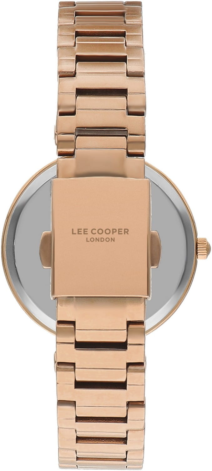 Женские часы Lee Cooper LC07711.410 — это стильное сочетание элегантности и современного дизайна. Круглый корпус диаметром 35 мм выполнен из суперметалла с IP-покрытиемIP-покрытиеМетод ионного напыления. Демонстрирует повышенную устойчивость к истиранию, окислению и химическим веществам. Под воздействием высокого давления и температуры около 1500°C молекулы металла надёжно соединяются с частицами корпуса часов. золотого цвета, придающий модели особый блеск. Изысканный циферблат защищен минеральным стекломМинеральное стеклоМинеральное стекло представляет собой искусственно выращенный минерал кварца. Такое стекло отличается особой устойчивостью к повреждениям и царапинам. Уступает по некоторым качествам сапфировому стеклу., обеспечивающим устойчивость к царапинам. Метки в виде штрихов. Часы оснащены надежным кварцевым механизмом, а стальной браслет с IP-покрытиемIP-покрытиеМетод ионного напыления. Демонстрирует повышенную устойчивость к истиранию, окислению и химическим веществам. Под воздействием высокого давления и температуры около 1500°C молекулы металла надёжно соединяются с частицами корпуса часов. на раскладной застёжкеРаскладная застёжкаТакой тип застёжки используется только на браслетах из металла. Она никогда не раскрывается полностью, происходит разделение на 2 и более частей. Раскладывающая застёжка снизит вероятность потери часов к минимуму. гарантирует комфортную посадку на запястье. Водозащита 30 метров защищает модель от случайных брызг и дождя. Lee Cooper  — отличный выбор для тех, кто ценит утонченность и качество.
