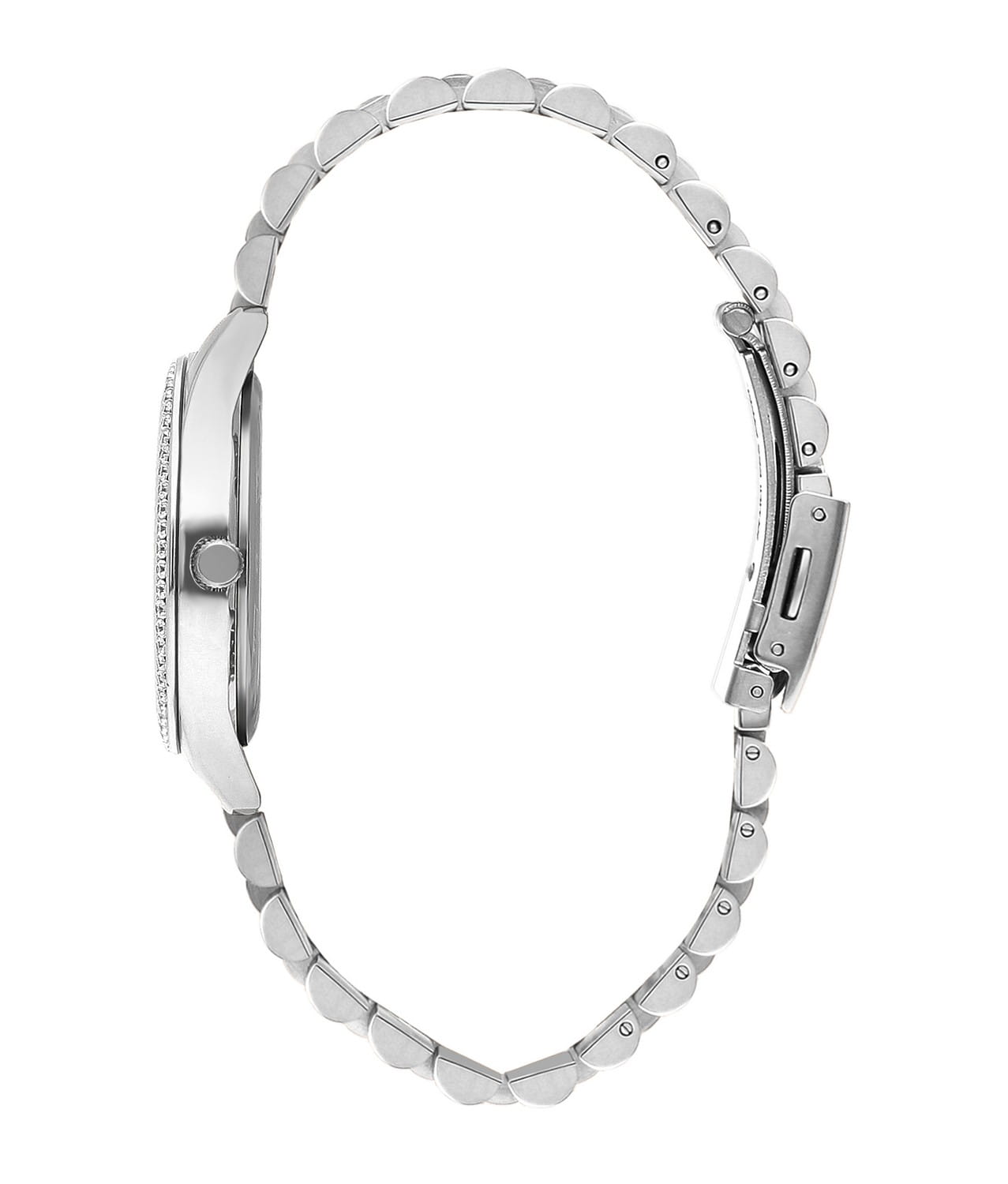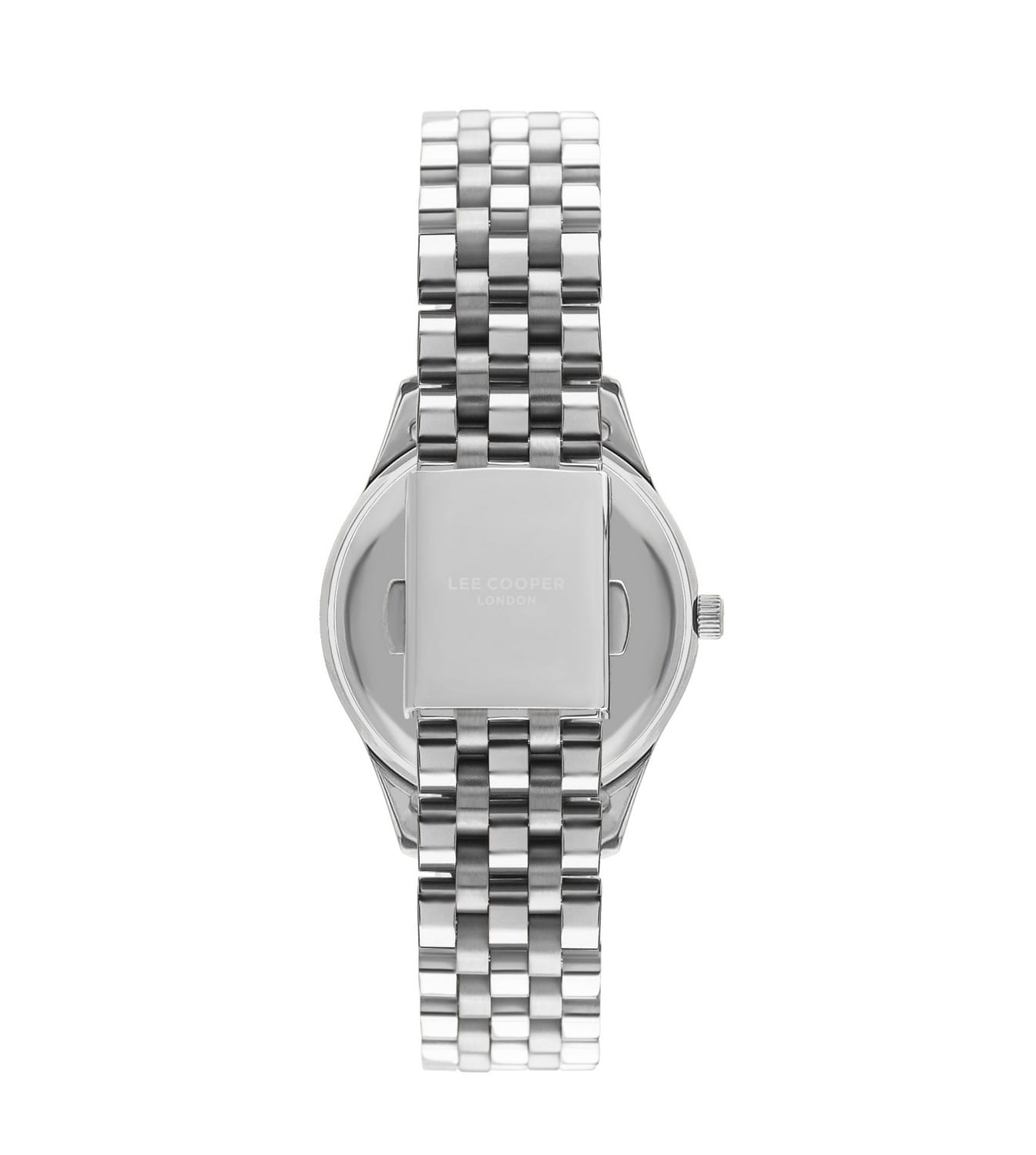 Женские часы Lee Cooper LC07826.380 выполнены в классическом стиле и сочетают строгий дизайн с надёжным механизмом. Модель оснащена кварцевым механизмом, обеспечивающим точность хода и минимальное обслуживание. Корпус круглой формы имеет размер 35 мм, изготовлен из суперметалла с изысканным неподвижным безелемБезельВнешний ободок, закрепляющий стекло. В спортивных часах так называется поворотное кольцо с делениями на циферблате, выполняет роль таймера – замеряет отрезки времени на шкале. Неподвижный безель – элемент декора. Однонаправленно вращающийся безель на дайверских часах позволяет фиксировать моменты погружения и выныривания на поверхность. с вставками из циркона, гарантирует комфорт при ношении. Циферблат дополнен изящными вставками из циркона для чёткого отсчёта времени. Защиту циферблата обеспечивает минеральное стеклоМинеральное стеклоМинеральное стекло представляет собой искусственно выращенный минерал кварца. Такое стекло отличается особой устойчивостью к повреждениям и царапинам. Уступает по некоторым качествам сапфировому стеклу., устойчивое к мелким механическим повреждениям. Стрелки с люминесцентным покрытиемЛюминесцентное покрытиеПозволяет считывать показания времени в темноте. Производители наносят на стрелки, часовые индексы, безель или поверхность циферблата светонакопительный состав, дающий холодное свечение.. Стальной браслет на раскладной застёжкеРаскладная застёжкаТакой тип застёжки используется только на браслетах из металла. Она никогда не раскрывается полностью, происходит разделение на 2 и более частей. Раскладывающая застёжка снизит вероятность потери часов к минимуму. гарантирует удобную посадку и надёжную фиксацию на запястье. Водозащита 30WR позволяет использовать часы в повседневных условиях без риска повреждения от случайных брызг воды. Это сочетание классического дизайна, прочности материалов и качества исполнения для уверенных в себе женщин.