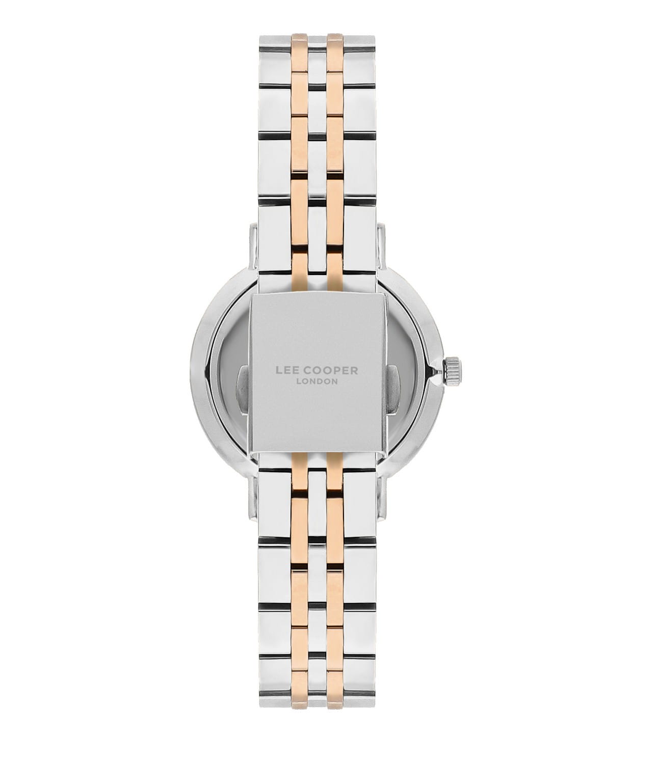 Женские часы Lee Cooper LC07857.530 — это стильное сочетание элегантности и современного дизайна. Изящный круглый корпус диаметром 34 мм выполнен из суперметалла с безелемБезельВнешний ободок, закрепляющий стекло. В спортивных часах так называется поворотное кольцо с делениями на циферблате, выполняет роль таймера – замеряет отрезки времени на шкале. Неподвижный безель – элемент декора. Однонаправленно вращающийся безель на дайверских часах позволяет фиксировать моменты погружения и выныривания на поверхность. с IP-покрытиемIP-покрытиеМетод ионного напыления. Демонстрирует повышенную устойчивость к истиранию, окислению и химическим веществам. Под воздействием высокого давления и температуры около 1500°C молекулы металла надёжно соединяются с частицами корпуса часов. золотого цвета, что придает модели особый блеск. Серебристый циферблат защищен минеральным стекломМинеральное стеклоМинеральное стекло представляет собой искусственно выращенный минерал кварца. Такое стекло отличается особой устойчивостью к повреждениям и царапинам. Уступает по некоторым качествам сапфировому стеклу., обеспечивающим устойчивость к царапинам. Метки в виде штрихов. Часы оснащены надежным кварцевым механизмом, а стальной браслет с частичным IP-покрытиемIP-покрытиеМетод ионного напыления. Демонстрирует повышенную устойчивость к истиранию, окислению и химическим веществам. Под воздействием высокого давления и температуры около 1500°C молекулы металла надёжно соединяются с частицами корпуса часов. на раскладной застёжкеРаскладная застёжкаТакой тип застёжки используется только на браслетах из металла. Она никогда не раскрывается полностью, происходит разделение на 2 и более частей. Раскладывающая застёжка снизит вероятность потери часов к минимуму. гарантирует комфортную посадку на запястье. Водозащита 30 метров защищает модель от случайных брызг и дождя. В комплекте к часам идет дополнительный браслет. Lee Cooper  — отличный выбор для тех, кто ценит утонченность и качество.