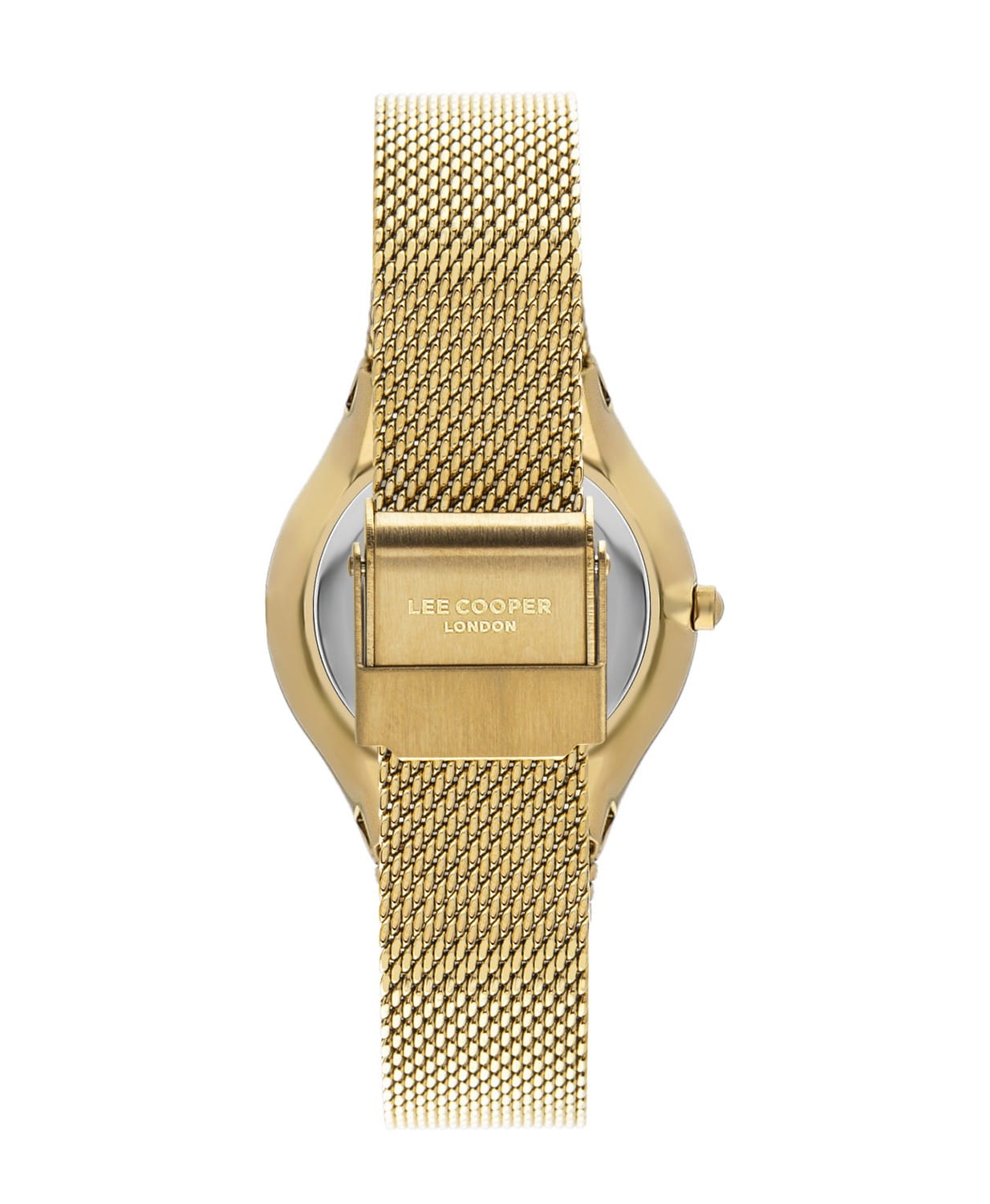 Женские часы Lee Cooper LC07862.130 — это стильное сочетание элегантности и современного дизайна. Изящный корпус диаметром 32 мм выполнен из суперметалла с IP-покрытиемIP-покрытиеМетод ионного напыления. Демонстрирует повышенную устойчивость к истиранию, окислению и химическим веществам. Под воздействием высокого давления и температуры около 1500°C молекулы металла надёжно соединяются с частицами корпуса часов. золотого цвета. Серый циферблат инкрустирован цирконами, что придает модели особый блеск и защищен минеральным стекломМинеральное стеклоМинеральное стекло представляет собой искусственно выращенный минерал кварца. Такое стекло отличается особой устойчивостью к повреждениям и царапинам. Уступает по некоторым качествам сапфировому стеклу., обеспечивающим устойчивость к царапинам. Центральные часовая, минутная стрелки. Часы оснащены надежным кварцевым механизмом. Стальной браслет с IP-покрытиемIP-покрытиеМетод ионного напыления. Демонстрирует повышенную устойчивость к истиранию, окислению и химическим веществам. Под воздействием высокого давления и температуры около 1500°C молекулы металла надёжно соединяются с частицами корпуса часов. с застежкой, выполненной в виде раскладного замкаРаскладной замокДанный вариант застежки используется только на часах с металлическим браслетом. Отличительная особенность такого крепления в том, что длина браслета становится универсальной и вы можете самостоятельно отрегулировать нужный вам размер – застежка просто двигается по браслету часов., гарантирующего комфортное и безопасное ношение. Водозащита 30 метров защищает модель от случайных брызг и дождя. Lee Cooper — отличный выбор для тех, кто ценит утонченность и качество.