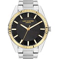 Мужские часы Lee Cooper LC07950.260 с корпусом 41,5 мм выполнены из суперметалла, золотистый безельБезельВнешний ободок, закрепляющий стекло. В спортивных часах так называется поворотное кольцо с делениями на циферблате, выполняет роль таймера – замеряет отрезки времени на шкале. Неподвижный безель – элемент декора. Однонаправленно вращающийся безель на дайверских часах позволяет фиксировать моменты погружения и выныривания на поверхность. из нержавеющей стали с IP-покрытиемIP-покрытиеМетод ионного напыления. Демонстрирует повышенную устойчивость к истиранию, окислению и химическим веществам. Под воздействием высокого давления и температуры около 1500°C молекулы металла надёжно соединяются с частицами корпуса часов. обеспечивает долговечность и надежность. Чёрный циферблат создаёт стильный и строгий образ. Минеральное стеклоМинеральное стеклоМинеральное стекло представляет собой искусственно выращенный минерал кварца. Такое стекло отличается особой устойчивостью к повреждениям и царапинам. Уступает по некоторым качествам сапфировому стеклу. защищает поверхность от царапин и других повреждений. Точный кварцевый механизм гарантирует стабильную работу. Водозащита 50 м позволяет выдерживать случайные контакты с водой. Стрелки и метки покрыты люминесцентным покрытиемЛюминесцентное покрытиеПозволяет считывать показания времени в темноте. Производители наносят на стрелки, часовые индексы, безель или поверхность циферблата светонакопительный состав, дающий холодное свечение., обеспечивающим отличную читаемость в темноте. Надёжный стальной браслет дополнен раскладной застёжкойРаскладная застёжкаТакой тип застёжки используется только на браслетах из металла. Она никогда не раскрывается полностью, происходит разделение на 2 и более частей. Раскладывающая застёжка снизит вероятность потери часов к минимуму. для удобной фиксации.