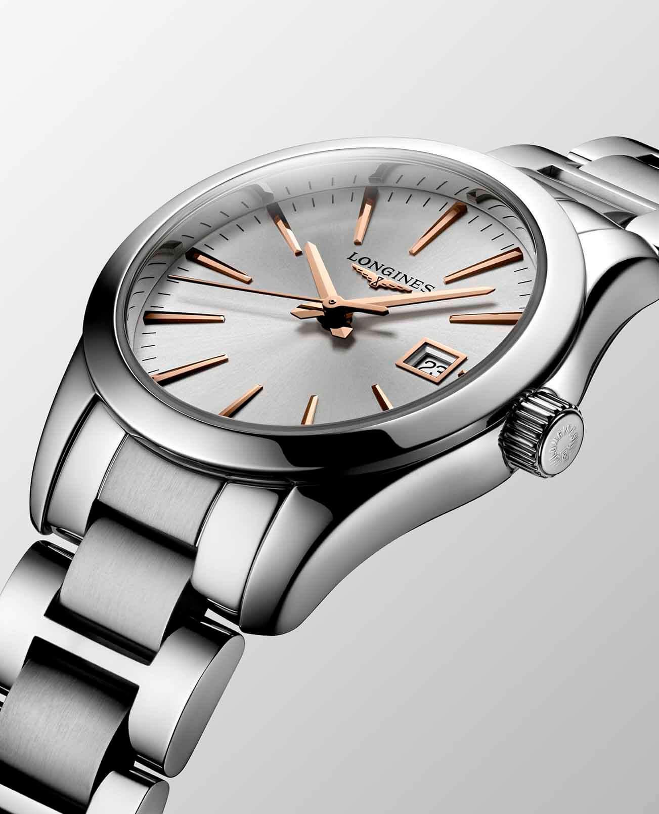 Женские швейцарские часы Longines Conquest Classic L2.286.4.72.6 – это изысканный аксессуар, способный придать вашему деловому образу особую элегантность и утонченность. Их сапфировое стеклоСапфировое стеклоПрочный и надёжный материал из кристалла сапфира синтетического происхождения, характеризующийся особой твёрдостью и устойчивостью к царапинам и повреждениям. с антибликовым покрытием не только защищает циферблат от повреждений, но и сохраняет его кристальную чистоту даже в ярком свете.