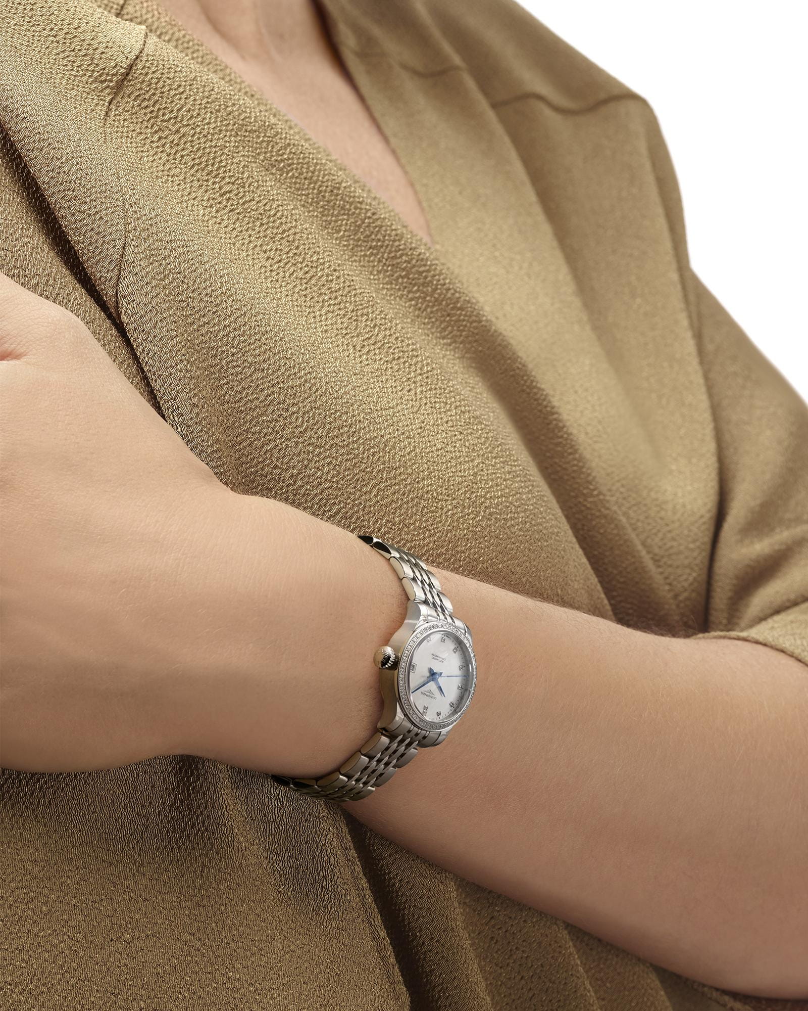 БезельБезельВнешний ободок, закрепляющий стекло. В спортивных часах так называется поворотное кольцо с делениями на циферблате, выполняет роль таймера – замеряет отрезки времени на шкале. Неподвижный безель – элемент декора. Однонаправленно вращающийся безель на дайверских часах позволяет фиксировать моменты погружения и выныривания на поверхность. усыпан 60 бриллиантами в 0,504 карат, на перламутровом циферблате – бриллиантовые метки общим весом в 0,037 карат. Швейцарский автоматический калибр L592.4 с запасом хода на 40 часов оснащён кремниевой спиралью, отвечающей за высокую точность хода. Часы удостоены сертификата хронометра COSCСертификат COSCОфициальный сертификат, подтверждающий то, что часы ходят с особо высокой точностью. Для получения документа часы подвергаются тестовым испытаниям, разработанным швейцарским институтом тестирования хронометров COSC. Допустимая норма для механических часов -4/+6 секунд в день, для кварцевых моделей +/- 0,07 секунд в день.. Стальной браслет сочетает матовые и полированные звенья.