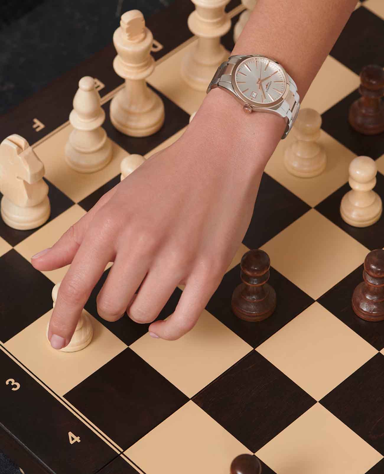 Швейцарский кварцевый калибр L156 — сердце этих часов, которое бьется с безупречной точностью. Сапфировое стеклоСапфировое стеклоПрочный и надёжный материал из кристалла сапфира синтетического происхождения, характеризующийся особой твёрдостью и устойчивостью к царапинам и повреждениям., покрытое многослойным антибликовым покрытиемАнтибликовое покрытиеСлой оксида металла в 0,13-0,3 микрон, благодаря которому стекло часов не бликует и не отражает свет. Антибликовое покрытие уменьшает отражение света в 10 раз, обеспечивая отличную читаемость показателей циферблата., защищает циферблат от внешних воздействий и позволяет наслаждаться его красотой даже при ярком солнечном свете. Стальной браслет с частичным PVD-покрытиемPVDУльтратонкое покрытие наносится в технике вакуумного напыления, сочетает в себе нитрид титана особой прочности со слоем золота или оксида хрома. Несёт в себе декоративную или защитную функцию. на застёжке «бабочка» с кнопкамиЗастёжка "бабочка"Такой вид застёжки дополняется предохранителями, помогающими избежать случайного раскрытия браслета. Обладают изящным исполнением.