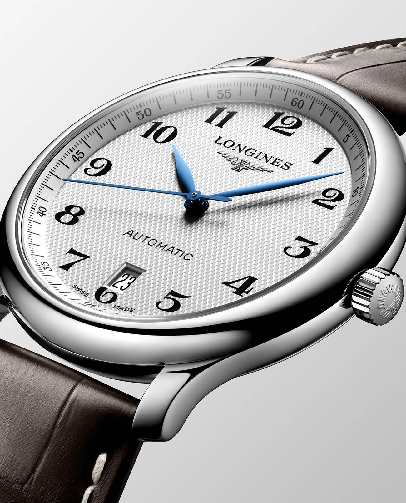 Узорчатый циферблат дополнен арабскими цифрами и контрастными стрелками. Швейцарский автоматический калибр L888 характеризуется запасом хода на 64 часа, прозрачная задняя крышка позволяет отслеживать движение деталей. Для изготовления корпуса использована антикоррозионная сталь 316L. Классический ремешок сделан из натуральной кожи аллигатора.