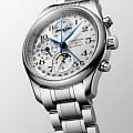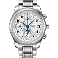 Мужские швейцарские механические часы-хронографХронографФункция позволяет измерять отрезки времени с особой точностью: часы, минуты, секунды. Верным признаком хронографа является наличие на циферблате 3 дополнительных окошек-счётчиков. с автоподзаводом Longines Master Collection L2.773.4.78.6. Сапфировое стеклоСапфировое стеклоПрочный и надёжный материал из кристалла сапфира синтетического происхождения, характеризующийся особой твёрдостью и устойчивостью к царапинам и повреждениям. устойчивое к появлению царапин, обладающее высокой прозрачностью. Корпус часов изготовлен из нержавеющей стали. Автоматический механизм с частотой баланса 28 800 полуколебаний в час и запасом хода, которого хватает примерно на 66 часов работы. Часы, минуты, малая секундная стрелка с 24-часовым индикатором в положении «9 часов». Дату показывает центральная стрелка с серповидным наконечником. Указатель фаз Луны в положении «6 часов». Класс водозащиты: 30 метров, позволит защитить корпус от случайных брызг или капель дождя. Стальной браслет на застёжке «бабочка» с кнопкамиЗастёжка "бабочка"Такой вид застёжки дополняется предохранителями, помогающими избежать случайного раскрытия браслета. Обладают изящным исполнением. .