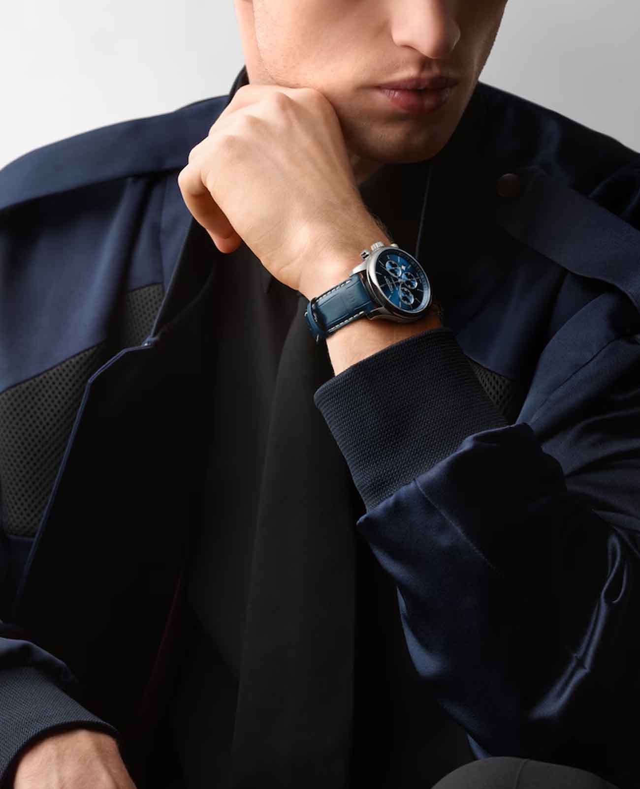 Для максимального комфорта и стиля часы комплектуются ремешком из натуральной кожи аллигатора, закрепленным на удобной и надежной застёжке «бабочка»Застёжка "бабочка"Такой вид застёжки дополняется предохранителями, помогающими избежать случайного раскрытия браслета. Обладают изящным исполнением. . Этот элемент конструкции обеспечивает плотную посадку часов на руке, одновременно придавая изделию элегантный и утончённый внешний вид.