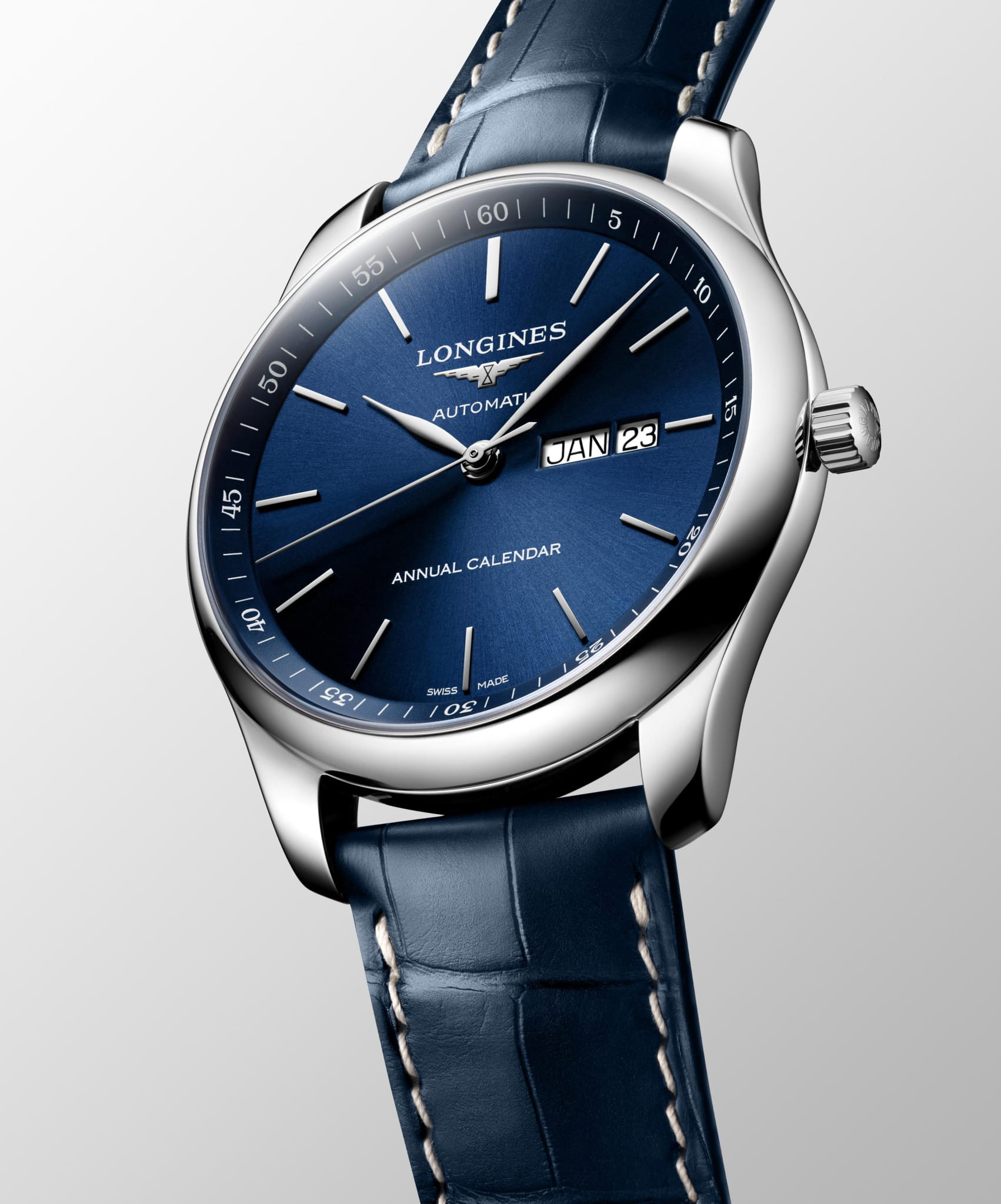 Синий циферблат украшен посеребренными полированными стрелками. Корпус из нержавеющей стали 316L надёжно защищает швейцарский кварцевый механизм L897. Сапфировое стекло, устойчивое к царапинам, дополнено многослойным антибликовым покрытиемАнтибликовое покрытиеСлой оксида металла в 0,13-0,3 микрон, благодаря которому стекло часов не бликует и не отражает свет. Антибликовое покрытие уменьшает отражение света в 10 раз, обеспечивая отличную читаемость показателей циферблата.. Водозащита 30 WR.