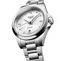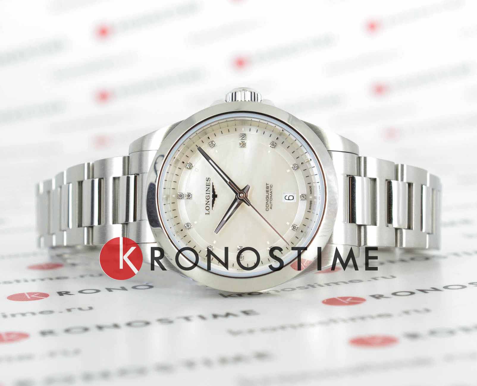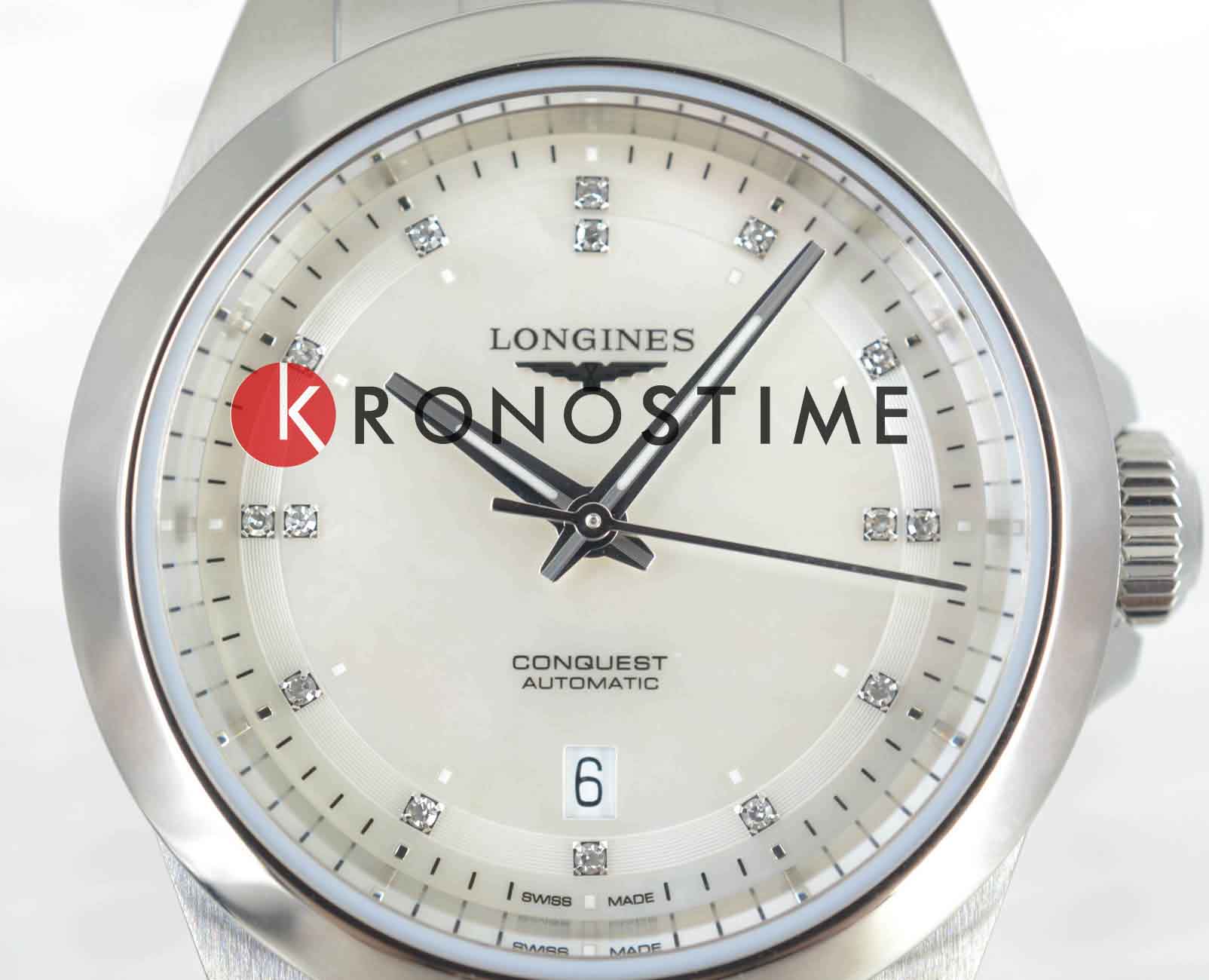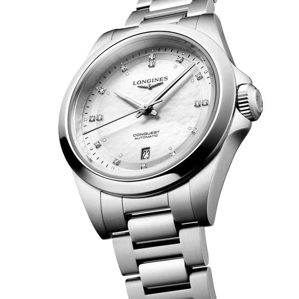 Швейцарские автоматические часы Conquest L3.320.4.87.6 с круглым корпусом из нержавеющей стали диаметром 30 мм оснащены механизмом калибра L592 с автоподзаводом, частотой 28'800 полуколебаний в час и запасом хода около 45 часов благодаря монокристаллической кремниевой спирали баланса. Циферблат защищен сапфировым стекломСапфировое стеклоПрочный и надёжный материал из кристалла сапфира синтетического происхождения, характеризующийся особой твёрдостью и устойчивостью к царапинам и повреждениям.. Прозрачная задняя крышка также выполнена из сапфирового стекла, позволяя наблюдать за работой механизма. Часы имеют водонепроницаемость до 10 бар, позволит плавать, нырять и заниматься другими водными видами спорта. Белый перламутровый циферблат украшен 15 бриллиантами группы Top Wesselton VS-SI общим весом 0.037 карата, а посеребренные полированные стрелки с люминесцентным покрытиемЛюминесцентное покрытиеПозволяет считывать показания времени в темноте. Производители наносят на стрелки, часовые индексы, безель или поверхность циферблата светонакопительный состав, дающий холодное свечение. Swiss Super-LumiNova® обеспечивают хорошую видимость в любое время суток. Удобный стальной браслет оснащён застёжкой бабочкойЗастёжка "бабочка"Такой вид застёжки дополняется предохранителями, помогающими избежать случайного раскрытия браслета. Обладают изящным исполнением. , обеспечивающей надёжную фиксацию часов на запястье и комфорт даже при длительном ношении.