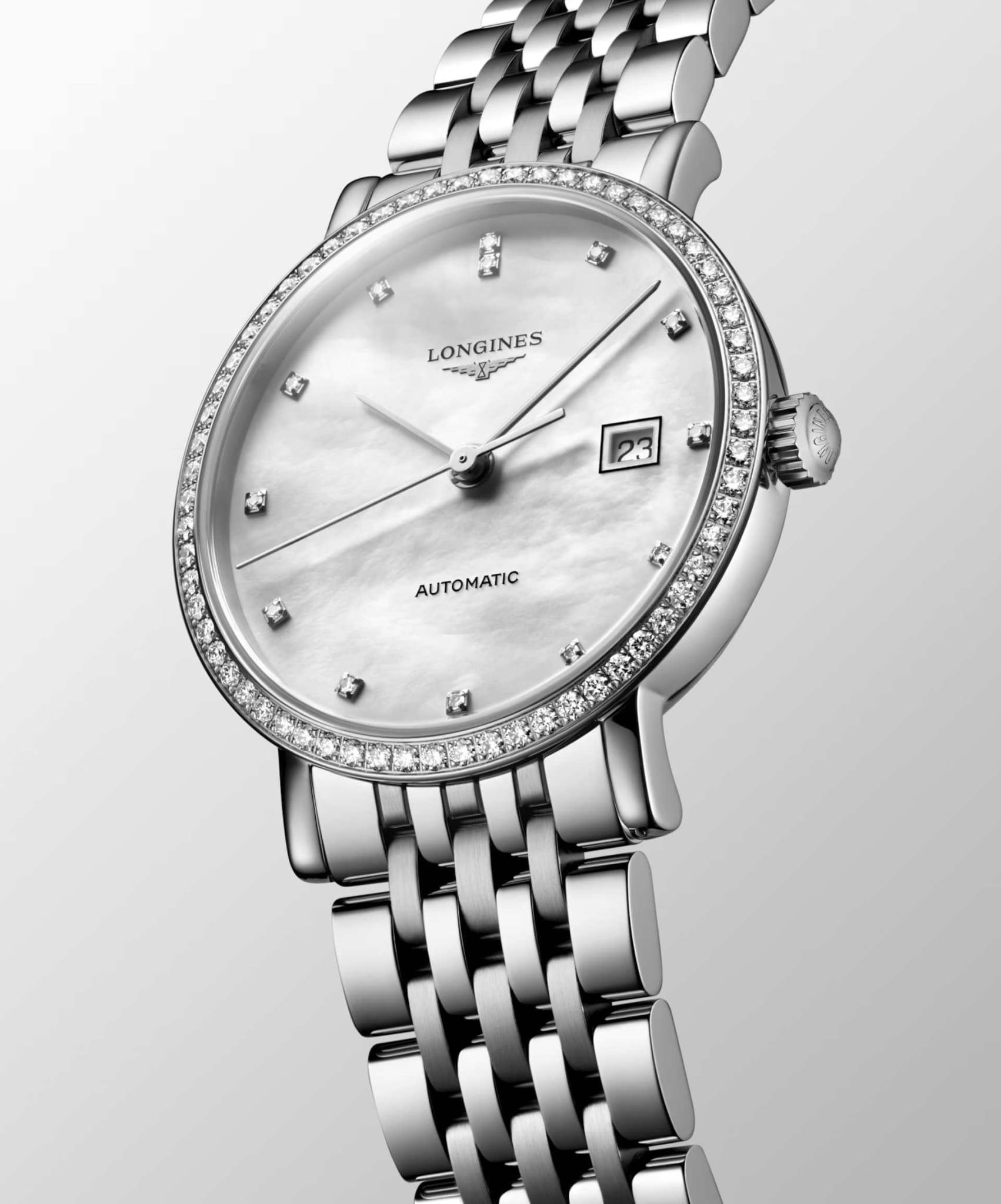 Изысканные женские часы Longines Elegant Collection L4.310.0.80.6 — это воплощение спокойной роскоши и вечного стиля. Все элементы циферблата подчеркивают элегантность и классический вкус модели. Корпус часов изготовлен из нержавеющей стали, диаметром 29 мм. БезельБезельВнешний ободок, закрепляющий стекло. В спортивных часах так называется поворотное кольцо с делениями на циферблате, выполняет роль таймера – замеряет отрезки времени на шкале. Неподвижный безель – элемент декора. Однонаправленно вращающийся безель на дайверских часах позволяет фиксировать моменты погружения и выныривания на поверхность. украшен 64 бриллиантами Top Wesselton IF-VVS общим весом 0,435 карата. Защиту циферблата обеспечивает прочное сапфировое стеклоСапфировое стеклоПрочный и надёжный материал из кристалла сапфира синтетического происхождения, характеризующийся особой твёрдостью и устойчивостью к царапинам и повреждениям. с антибликовым покрытиемАнтибликовое покрытиеСлой оксида металла в 0,13-0,3 микрон, благодаря которому стекло часов не бликует и не отражает свет. Антибликовое покрытие уменьшает отражение света в 10 раз, обеспечивая отличную читаемость показателей циферблата. гарантирующее четкость показаний. Циферблат украшен 13 бриллиантами Top Wesselton VS-SI общим весом 0,029 карата. Автоматический механизм L592 обеспечивает высокую точность и простоту использования. Водостойкость до 30 метров позволит плавать, нырять и заниматься другими водными видами спорта. Изысканный браслет выполнен из нержавеющей стали на застёжке-бабочке с кнопкамиЗастёжка "бабочка"Такой вид застёжки дополняется предохранителями, помогающими избежать случайного раскрытия браслета. Обладают изящным исполнением. , обеспечивающей комфортное ношение и надёжную фиксацию на запястье. Окошко даты в положении 3 часа. Коллекция The Elegant Collection сочетает в себе классическую элегантность и современный подход к дизайну, делая эти часы универсальным аксессуаром — как для торжественных случаев, так и для повседневной жизни.