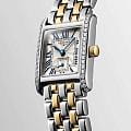 Изысканные женские часы LONGINES Mini DolceVita L5.200.5.78.7 — это воплощение спокойной роскоши и вечного стиля. Модель выполнена в прямоугольном корпусе размером 21.50 x 29.00 мм, изготовленном из нержавеющей стали и инкрустированы 38 бриллиантов Top Wesselton IF-VVS общим весом 0,456 карата. Циферблат серебристого цвета оформлен в технике flinqué , придающей ему особую глубину и переливы на свету. Часовая шкала отмечена нарисованными римскими цифрами , а для точности хода предусмотрены вороненые стальные стрелки и малая секундная стрелка в положении «6 часов». Все элементы циферблата подчеркивают элегантность и классический вкус модели. Защиту циферблата обеспечивает прочное сапфировое стеклоСапфировое стеклоПрочный и надёжный материал из кристалла сапфира синтетического происхождения, характеризующийся особой твёрдостью и устойчивостью к царапинам и повреждениям. с многослойным антибликовым покрытиемАнтибликовое покрытиеСлой оксида металла в 0,13-0,3 микрон, благодаря которому стекло часов не бликует и не отражает свет. Антибликовое покрытие уменьшает отражение света в 10 раз, обеспечивая отличную читаемость показателей циферблата. с обеих сторон, гарантирующее четкость показаний в любых условиях освещения. Механизм L178 (RENATA 379) — кварцевый калибр, который обеспечивает высокую точность и простоту использования. Также реализована функция EOLEOLПредставляет собой систему, уведомляющую владельца часов о необходимости замены элемента питания. За 2 недели до полного разряда батарейки секундная стрелка перестаёт ходить чётко и начинает перепрыгивать на 3-4 деления. (End of Life) — сигнал о замене батарейки. Корпус водонепроницаем до WR30 (3 АТМ) , что позволяет носить часы в повседневных условиях без опасений за сохранность механизма. Толщина составляет всего 6.75 мм , а общий вес — 65 г , что делает модель легкой и удобной для ежедневного ношения. Браслет выполнен из нержавеющей стали и желтого 18-каратного золото18-каратное золотоОбозначение по каратной системе пробирования, оно показывает, сколько драгоценного металла содержится в изделии. 18 карат - в составе 75% чистого золота, соответствует 750 пробе.