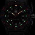 Швейцарский кварцевый механизм RONDA с аналоговой индикацией. Точность хода с погрешностью не более -10/+20 сек. в месяц. Центральные часовая, минутная и секундная стрелки. Индикация даты в апертуре на отметке «3 часа». Комбинированный корпус из композитного полимерного материала армированного углеволокном - карбона. Диаметр корпуса составляет 45 мм, толщина – 13 мм. Поворотный однонаправленный безель, вращающийся щелчками против хода часовой стрелки. Капсула на «12 часах» со светящимся оранжевым элементом «тригалайт». Сапфировое стекло с антибликовым покрытием имеет повышенную стойкость к появлению царапин. Циферблат с гладкой поверхностью, контрастные рисованные цифры и разметка в стиле «милитари». Яркая фирменная подсветка с газообразным тритием – на часовой и минутной стрелках, а так же на разметке циферблата установлены микроскопические запаянные трубочки с газообразным тритием, обеспечивающие непрерывное свечение до 25 лет подряд, зеленого и оранжевого цветов. Задняя крышка имеет винтовое соединение с корпусом. Переводная коронка имеет двойную защиту Double-Security Gasket. Водостойкость 200 метров (20 АТМ). Прочный и эластичный полимерный ремешок с тисненой поверхностью, стандартная застежка с двойным шипом.