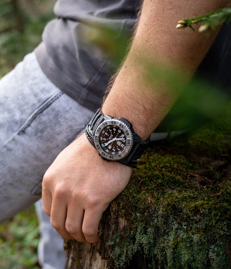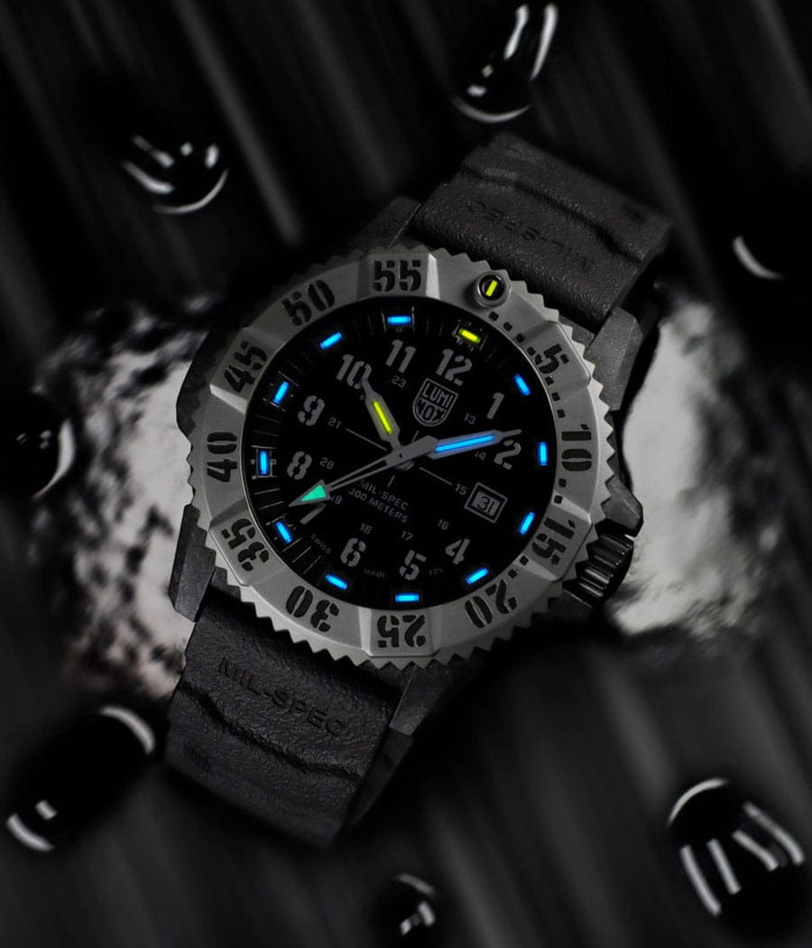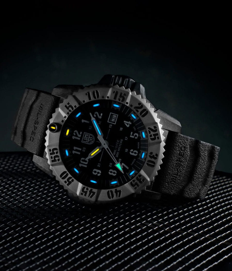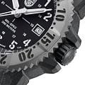 Luminox XL.3513.S.SET — мужская модель из коллекции Navy SEAL с мощным и функциональным дизайном, ориентированным на экстремальные условия. Корпус диаметром 46 мм выполнен из лёгкого и прочного углеродного композита Carbon Core GuardCarbon Core Guard Новейшая структура корпуса, разработанная Casio. Полиуретановая пластина дополнительно усилена карбоновыми вставками, что придаёт специальную защиту от механических повреждений. Карбон отличается лёгкостью и прочностью., а массивный односторонний вращающийся безельБезельВнешний ободок, закрепляющий стекло. В спортивных часах так называется поворотное кольцо с делениями на циферблате, выполняет роль таймера – замеряет отрезки времени на шкале. Неподвижный безель – элемент декора. Однонаправленно вращающийся безель на дайверских часах позволяет фиксировать моменты погружения и выныривания на поверхность. изготовлен из нержавеющей стали и дополнен крупной минутной разметкой для удобства под водой. Защитную функцию выполняет сапфировое стеклоСапфировое стеклоПрочный и надёжный материал из кристалла сапфира синтетического происхождения, характеризующийся особой твёрдостью и устойчивостью к царапинам и повреждениям. с антибликовым покрытиемАнтибликовое покрытиеСлой оксида металла в 0,13-0,3 микрон, благодаря которому стекло часов не бликует и не отражает свет. Антибликовое покрытие уменьшает отражение света в 10 раз, обеспечивая отличную читаемость показателей циферблата., обеспечивающим читаемость в любых условиях. В основе лежит швейцарский кварцевый механизм с индикацией часов, минут, секунд, даты и центральной секундной стрелкой. Водозащита 300 м (30 бар) соответствует профессиональным стандартам дайвинга. Метки и стрелки оснащены системой постоянной подсветки Luminox Light Technology, гарантирующей видимость до 25 лет без подзарядки. Модель укомплектована каучуковым ремешком с классической застёжкой, который обеспечивает комфорт и долговечность в носке. Так же в комплекте идет тканевый ремешок.