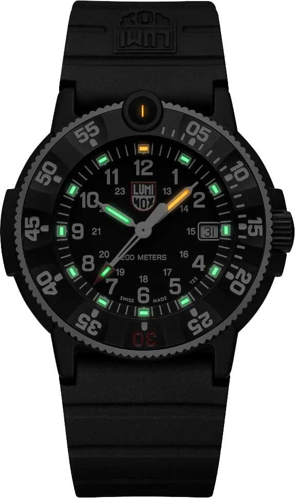Часы Luminox XS.3001.H.SET — это символ надежности и стиля, созданный специально для мужчин, которые не знают преград. Эти швейцарские часы, посвященные 35-летию создания первых моделей Luminox, оснащены кварцевым механизмом с калибром ETA F06.412, обеспечивающим высокую точность. Корпус выполнен из прочного карбона CARBONOX со стальной вставкой, что делает его устойчивым к износу и внешним воздействиям. Черный циферблат защищен сапфировым стекломСапфировое стеклоПрочный и надёжный материал из кристалла сапфира синтетического происхождения, характеризующийся особой твёрдостью и устойчивостью к царапинам и повреждениям. с антибликовым покрытиемАнтибликовое покрытиеСлой оксида металла в 0,13-0,3 микрон, благодаря которому стекло часов не бликует и не отражает свет. Антибликовое покрытие уменьшает отражение света в 10 раз, обеспечивая отличную читаемость показателей циферблата., что повышает его долговечность и улучшает читаемость при ярком освещении. Водозащита до 200 метров позволяет использовать часы в самых экстремальных условиях, включая водные виды спорта. Часы поддерживают 12- и 24-часовой формат времени, а метки в виде арабских цифр и окошко даты в положении 3 часа добавляют удобства в повседневном использовании. Специальная технология LLTLLTLLT — это автономный механизм подсветки, основанный на использовании микроскопических газонаполненных элементов. Специальные герметичные капсулы из боросиликатного стекла, интегрированные в циферблат, генерируют свечение без необходимости подключения к внешним источникам энергии. Для их работы не требуется ни дополнительный свет, ни механическое воздействие (например, нажатие кнопки). Свечение возникает благодаря химическому процессу: реакция между тритием, заключенным в капсулах, и люминофорным покрытием создает стабильное автономное освещение. Технология обеспечивает энергетическую независимость и долговечность подсветки.-подсветки позволяет определять время в полной темноте на протяжении 25 лет. Стальной вращающийся безельБезельВнешний ободок, закрепляющий стекло. В спортивных часах так называется поворотное кольцо с делениями на циферблате, выполняет роль таймера – замеряет отрезки времени на шкале. Неподвижный безель – элемент декора. Однонаправленно вращающийся безель на дайверских часах позволяет фиксировать моменты погружения и выныривания на поверхность. c PVD-покрытиемPVDУльтратонкое покрытие наносится в технике вакуумного напыления, сочетает в себе нитрид титана особой прочности со слоем золота или оксида хрома. Несёт в себе декоративную или защитную функцию. со светящейся меткой на 12 часов вращается в одном направлении, обеспечивая дополнительный комфорт и функциональность. Завинчивающаяся заводная головка с защитой и стальная задняя крышка с гравировкой из стали 316L повышают герметичность и долговечность конструкции. Батарея часов рассчитана на 50 месяцев работы. Удобный полиуретановый ремешок с классической застежкой обеспечивает комфортное ношение. В комплекте идет монета Luminox Challenge, посвященная 35-летнему юбилею создания часов.