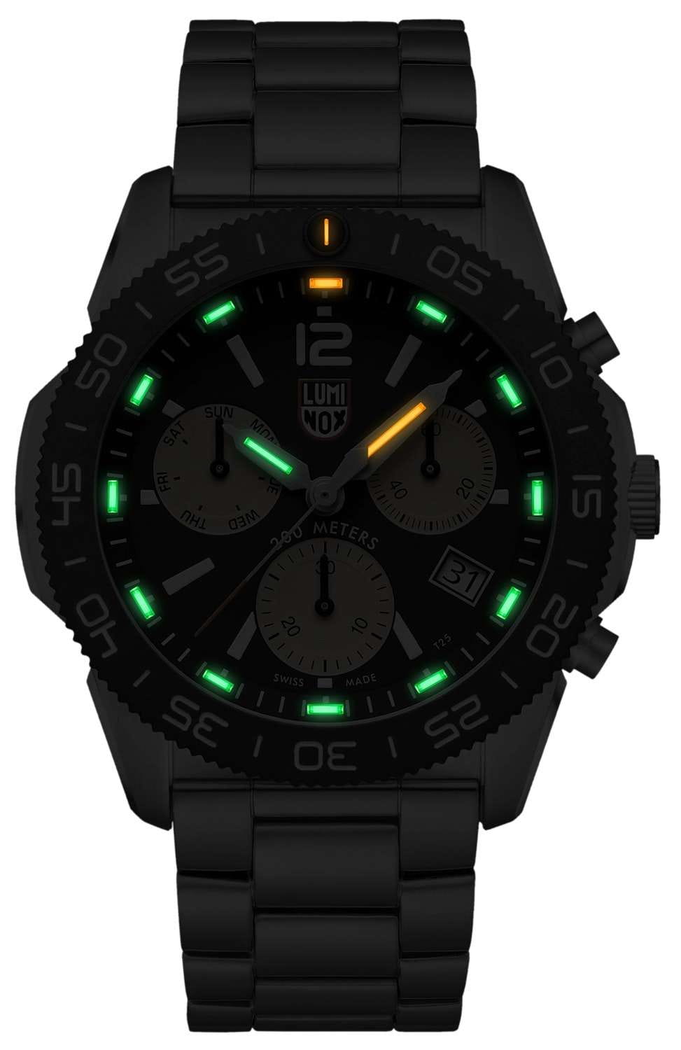 Швейцарские наручные часы Luminox Pacific Diver Chronograph XS.3150.M – это идеальный симбиоз стиля и высокой функциональности. Оснащенные высокоточным кварцевым механизмом, они гарантируют безупречное времяизмерение и надежность в любом случае. Часы-хронографХронографФункция позволяет измерять отрезки времени с особой точностью: часы, минуты, секунды. Верным признаком хронографа является наличие на циферблате 3 дополнительных окошек-счётчиков. обладают функцией секундомераСекундомерСекундоме́р — прибор, способный измерять интервалы времени с точностью до долей секунды., что делает их практичными в использовании. Циферблат этих часов защищен сапфировым стекломСапфировое стеклоПрочный и надёжный материал из кристалла сапфира синтетического происхождения, характеризующийся особой твёрдостью и устойчивостью к царапинам и повреждениям. с антибликовым покрытиемАнтибликовое покрытиеСлой оксида металла в 0,13-0,3 микрон, благодаря которому стекло часов не бликует и не отражает свет. Антибликовое покрытие уменьшает отражение света в 10 раз, обеспечивая отличную читаемость показателей циферблата., которое славится своей прочностью и устойчивостью к царапинам, обеспечивая кристально чистый обзор. Корпус часов выполнен из качественной стали, что свидетельствует о долговечности и прочности изделия. Стрелки с LLTLLTLLT — это автономный механизм подсветки, основанный на использовании микроскопических газонаполненных элементов. Специальные герметичные капсулы из боросиликатного стекла, интегрированные в циферблат, генерируют свечение без необходимости подключения к внешним источникам энергии. Для их работы не требуется ни дополнительный свет, ни механическое воздействие (например, нажатие кнопки). Свечение возникает благодаря химическому процессу: реакция между тритием, заключенным в капсулах, и люминофорным покрытием создает стабильное автономное освещение. Технология обеспечивает энергетическую независимость и долговечность подсветки.-подсветкой, обеспечивают отличную видимость даже в условиях недостаточной освещенности, что делает их удобными для использования в любых условиях. Дополнительно часы располагают окошком даты в положении 4 часа, позволяющим быстро и удобно отслеживать текущую дату. Их внушительный класс водозащиты в 200 метров делает их идеальными для любителей водных видов спорта, таких как плавание и ныряние, не беспокоясь о повреждении механизма. Стальной ремешок, надёжно фиксирующий часы на запястье с помощью раскладной застёжкиРаскладная застёжкаТакой тип застёжки используется только на браслетах из металла. Она никогда не раскрывается полностью, происходит разделение на 2 и более частей. Раскладывающая застёжка снизит вероятность потери часов к минимуму., обеспечивает комфортное ношение в течение всего дня. Стильный вращающийся безельБезельВнешний ободок, закрепляющий стекло. В спортивных часах так называется поворотное кольцо с делениями на циферблате, выполняет роль таймера – замеряет отрезки времени на шкале. Неподвижный безель – элемент декора. Однонаправленно вращающийся безель на дайверских часах позволяет фиксировать моменты погружения и выныривания на поверхность., изготовленный из карбонаКарбонОт «carbon», «carbone» - углерод, углепластик - полимерный композиционный материал из переплетён