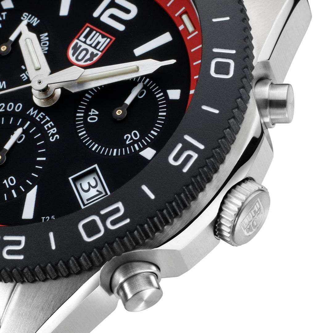 Швейцарские наручные часы Luminox Pacific Diver Chronograph XS.3155.SET – это идеальный симбиоз стиля и высокой функциональности. Оснащенные высокоточным кварцевым механизмом, они гарантируют безупречное времяизмерение и надежность в любом случае. Часы-хронографХронографФункция позволяет измерять отрезки времени с особой точностью: часы, минуты, секунды. Верным признаком хронографа является наличие на циферблате 3 дополнительных окошек-счётчиков. обладают функцией секундомераСекундомерСекундоме́р — прибор, способный измерять интервалы времени с точностью до долей секунды., что делает их практичными в использовании. Циферблат этих часов защищен сапфировым стекломСапфировое стеклоПрочный и надёжный материал из кристалла сапфира синтетического происхождения, характеризующийся особой твёрдостью и устойчивостью к царапинам и повреждениям. с антибликовым покрытиемАнтибликовое покрытиеСлой оксида металла в 0,13-0,3 микрон, благодаря которому стекло часов не бликует и не отражает свет. Антибликовое покрытие уменьшает отражение света в 10 раз, обеспечивая отличную читаемость показателей циферблата., которое славится своей прочностью и устойчивостью к царапинам, обеспечивая кристально чистый обзор. Корпус часов выполнен из качественной стали, что свидетельствует о долговечности и прочности изделия. Стрелки с LLTLLTLLT — это автономный механизм подсветки, основанный на использовании микроскопических газонаполненных элементов. Специальные герметичные капсулы из боросиликатного стекла, интегрированные в циферблат, генерируют свечение без необходимости подключения к внешним источникам энергии. Для их работы не требуется ни дополнительный свет, ни механическое воздействие (например, нажатие кнопки). Свечение возникает благодаря химическому процессу: реакция между тритием, заключенным в капсулах, и люминофорным покрытием создает стабильное автономное освещение. Технология обеспечивает энергетическую независимость и долговечность подсветки.-подсветкой, обеспечивают отличную видимость даже в условиях недостаточной освещенности, что делает их удобными для использования в любых условиях. Дополнительно часы располагают окошком даты в положении 4 часа, позволяющим быстро и удобно отслеживать текущую дату. Их внушительный класс водозащиты в 200 метров делает их идеальными для любителей водных видов спорта, таких как плавание и ныряние, не беспокоясь о повреждении механизма. Каучуковый красный ремешок, надёжно фиксирующий часы на запястье с помощью раскладной застёжкиРаскладная застёжкаТакой тип застёжки используется только на браслетах из металла. Она никогда не раскрывается полностью, происходит разделение на 2 и более частей. Раскладывающая застёжка снизит вероятность потери часов к минимуму., обеспечивает комфортное ношение в течение всего дня. Стильный вращающийся безельБезельВнешний ободок, закрепляющий стекло. В спортивных часах так называется поворотное кольцо с делениями на циферблате, выполняет роль таймера – замеряет отрезки времени на шкале. Неподвижный безель – элемент декора. Однонаправленно вращающийся безель на дайверских часах позволяет фиксировать моменты погружения и выныривания на поверхность., изготовленный из карбонаКарбонОт «carbon», «carbone» - углерод, углепластик - полимерный композиционный материал из