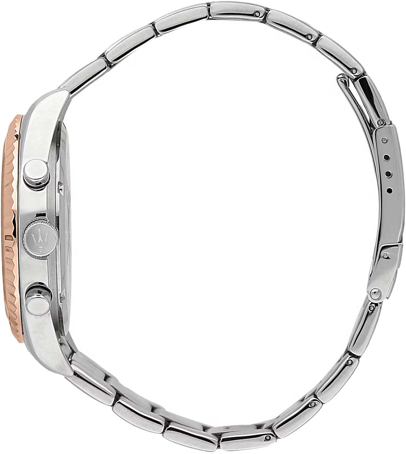 Часы Maserati Competizione R8853100040 отличаются стильным и современным дизайном, идеально подходящим для деловых и повседневных образов. Эти наручные часы оснащены надёжным кварцевым механизмом, который обеспечивает высокую точность показаний времени. Корпус часов диаметром 43 мм выполнен из прочной стали, что гарантирует долговечность и устойчивость к внешним воздействиям. Минеральное стеклоМинеральное стеклоМинеральное стекло представляет собой искусственно выращенный минерал кварца. Такое стекло отличается особой устойчивостью к повреждениям и царапинам. Уступает по некоторым качествам сапфировому стеклу. защищает циферблат. Часы обладают водостойкостью до 100 метров (10 АТМ), что позволяет не беспокоиться о попадании влаги при плавании или занятиях водными видами спорта. Стальной браслет с раскладной застёжкойРаскладная застёжкаТакой тип застёжки используется только на браслетах из металла. Она никогда не раскрывается полностью, происходит разделение на 2 и более частей. Раскладывающая застёжка снизит вероятность потери часов к минимуму. не только обеспечивает комфортное ношение, но и придаёт аксессуару дополнительную элегантность, подчёркивая его современный стиль. Люминесцентное покрытиеЛюминесцентное покрытиеПозволяет считывать показания времени в темноте. Производители наносят на стрелки, часовые индексы, безель или поверхность циферблата светонакопительный состав, дающий холодное свечение. на стрелках обеспечивает отличную видимость в темноте. Циферблат выполнен по технологии Sunray (солнечные лучи) и украшен фирменным логотипом «Maserati». Метки в виде штрихов. Граненый безель. Эти часы станут отличным дополнением к вашему гардеробу, сочетая в себе функциональность и изысканный дизайн.