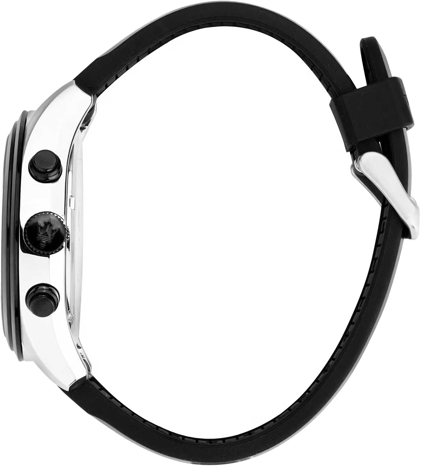 Мужские часы Maserati Traguardo R8871612044 — это стильное сочетание элегантности и современного дизайна. Корпус из нержавеющей стали диаметром 45 мм идеально сбалансирован и элегантен. Минеральное стеклоМинеральное стеклоМинеральное стекло представляет собой искусственно выращенный минерал кварца. Такое стекло отличается особой устойчивостью к повреждениям и царапинам. Уступает по некоторым качествам сапфировому стеклу. защищает циферблат от царапин. Силиконовый ремешок на стандартной застёжке идеально дополняют дизайн часов, обеспечивая комфортное ношение. Стрелки и метки с люминесцентным покрытиемЛюминесцентное покрытиеПозволяет считывать показания времени в темноте. Производители наносят на стрелки, часовые индексы, безель или поверхность циферблата светонакопительный состав, дающий холодное свечение.. БезельБезельВнешний ободок, закрепляющий стекло. В спортивных часах так называется поворотное кольцо с делениями на циферблате, выполняет роль таймера – замеряет отрезки времени на шкале. Неподвижный безель – элемент декора. Однонаправленно вращающийся безель на дайверских часах позволяет фиксировать моменты погружения и выныривания на поверхность. с частичным IP-покрытиемIP-покрытиеМетод ионного напыления. Демонстрирует повышенную устойчивость к истиранию, окислению и химическим веществам. Под воздействием высокого давления и температуры около 1500°C молекулы металла надёжно соединяются с частицами корпуса часов.. Часы обладают впечатляющей водонепроницаемостью до 10 бар (100 метров), что делает их идеальными для повседневной носки. Часы-хронографХронографФункция позволяет измерять отрезки времени с особой точностью: часы, минуты, секунды. Верным признаком хронографа является наличие на циферблате 3 дополнительных окошек-счётчиков. оборудованы надёжным кварцевым механизмом. Метки в виде штрихов. Завинчивающаяся задняя крышка и заводная головка.
