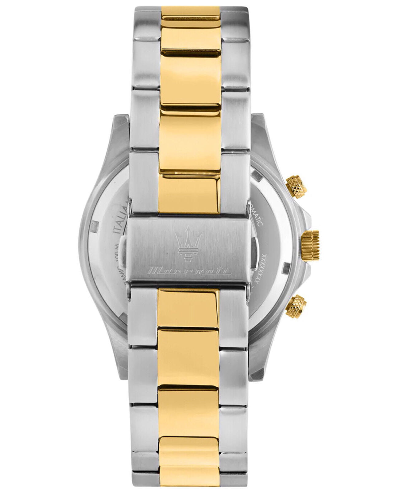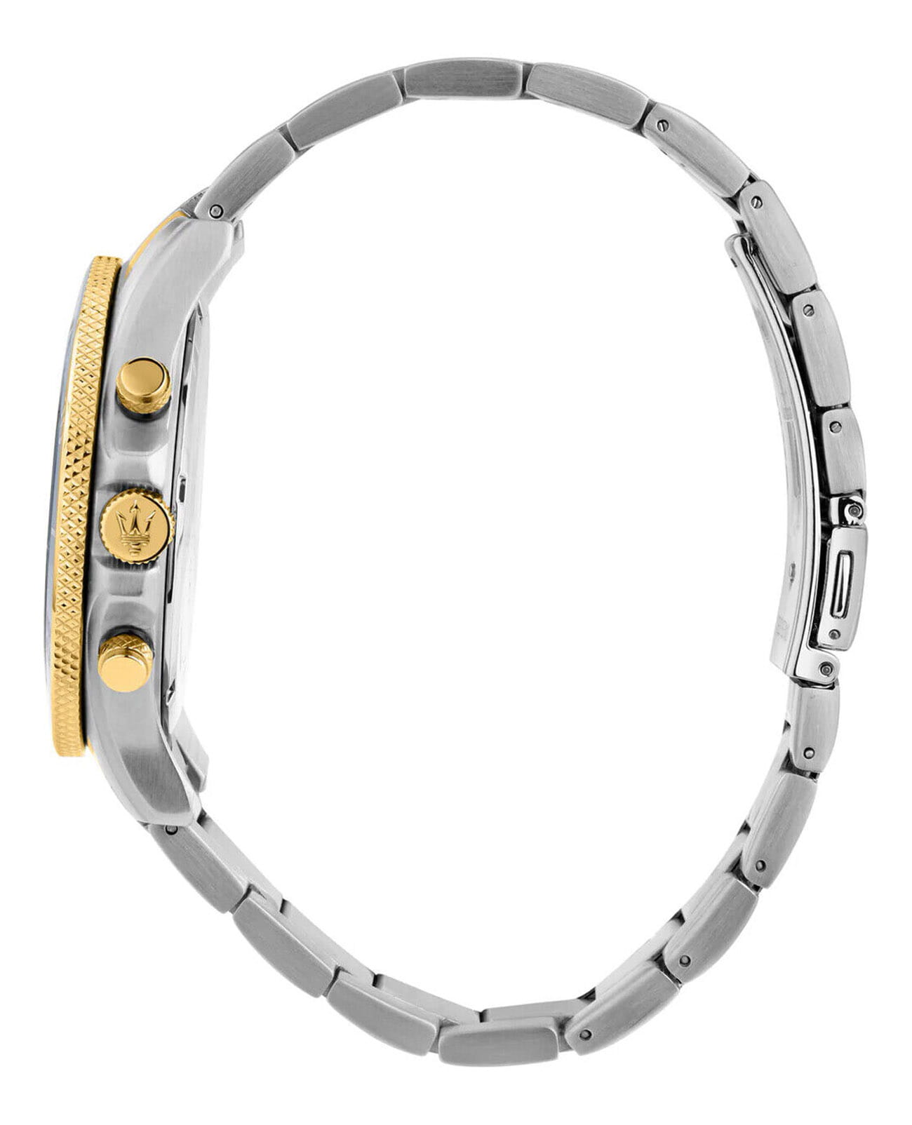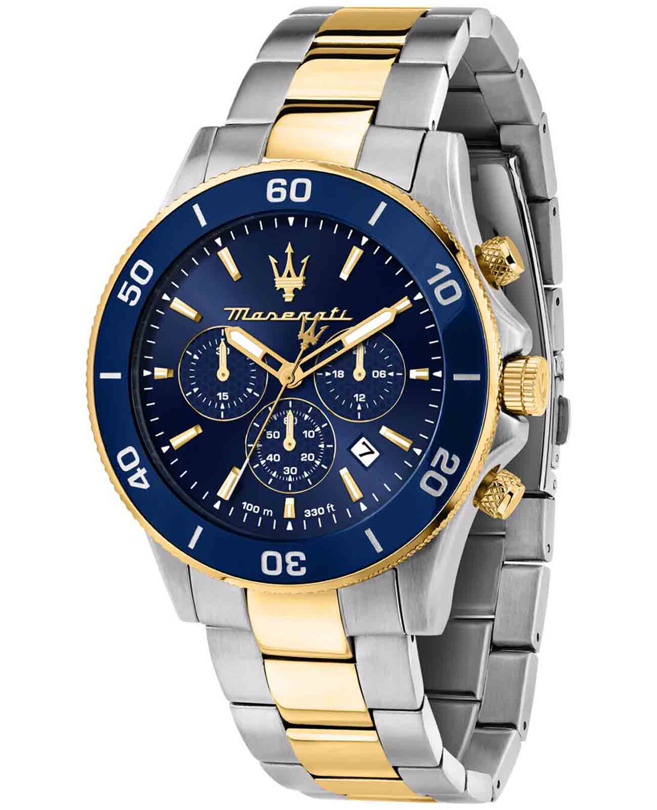 Мужские итальянские часы- хронографХронографФункция позволяет измерять отрезки времени с особой точностью: часы, минуты, секунды. Верным признаком хронографа является наличие на циферблате 3 дополнительных окошек-счётчиков. Maserati Competizione Chronograph R8873600006, кварцевый механизм с высокой точностью. Корпус часов изготовлен из стали. БезельБезельВнешний ободок, закрепляющий стекло. В спортивных часах так называется поворотное кольцо с делениями на циферблате, выполняет роль таймера – замеряет отрезки времени на шкале. Неподвижный безель – элемент декора. Однонаправленно вращающийся безель на дайверских часах позволяет фиксировать моменты погружения и выныривания на поверхность. из стали с PVD-покрытиемPVDУльтратонкое покрытие наносится в технике вакуумного напыления, сочетает в себе нитрид титана особой прочности со слоем золота или оксида хрома. Несёт в себе декоративную или защитную функцию.. Стрелки с люминесцентным покрытиемЛюминесцентное покрытиеПозволяет считывать показания времени в темноте. Производители наносят на стрелки, часовые индексы, безель или поверхность циферблата светонакопительный состав, дающий холодное свечение.. Класс водозащиты: 100 метров, позволит плавать, нырять и заниматься другими водными видами спорта. Стальной браслет с частичным PVD-покрытиемPVDУльтратонкое покрытие наносится в технике вакуумного напыления, сочетает в себе нитрид титана особой прочности со слоем золота или оксида хрома. Несёт в себе декоративную или защитную функцию. на раскладной застёжкойРаскладная застёжкаТакой тип застёжки используется только на браслетах из металла. Она никогда не раскрывается полностью, происходит разделение на 2 и более частей. Раскладывающая застёжка снизит вероятность потери часов к минимуму..
