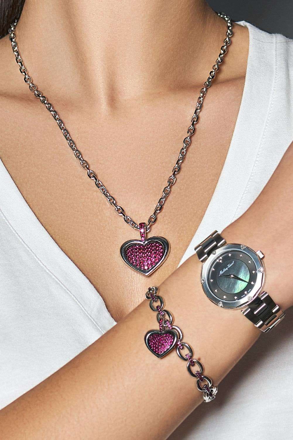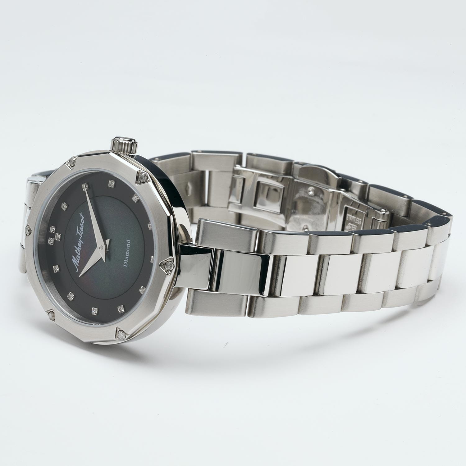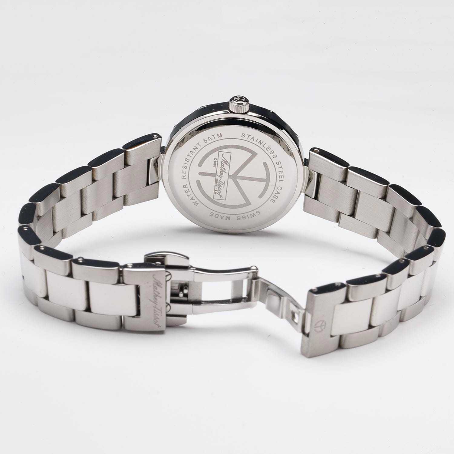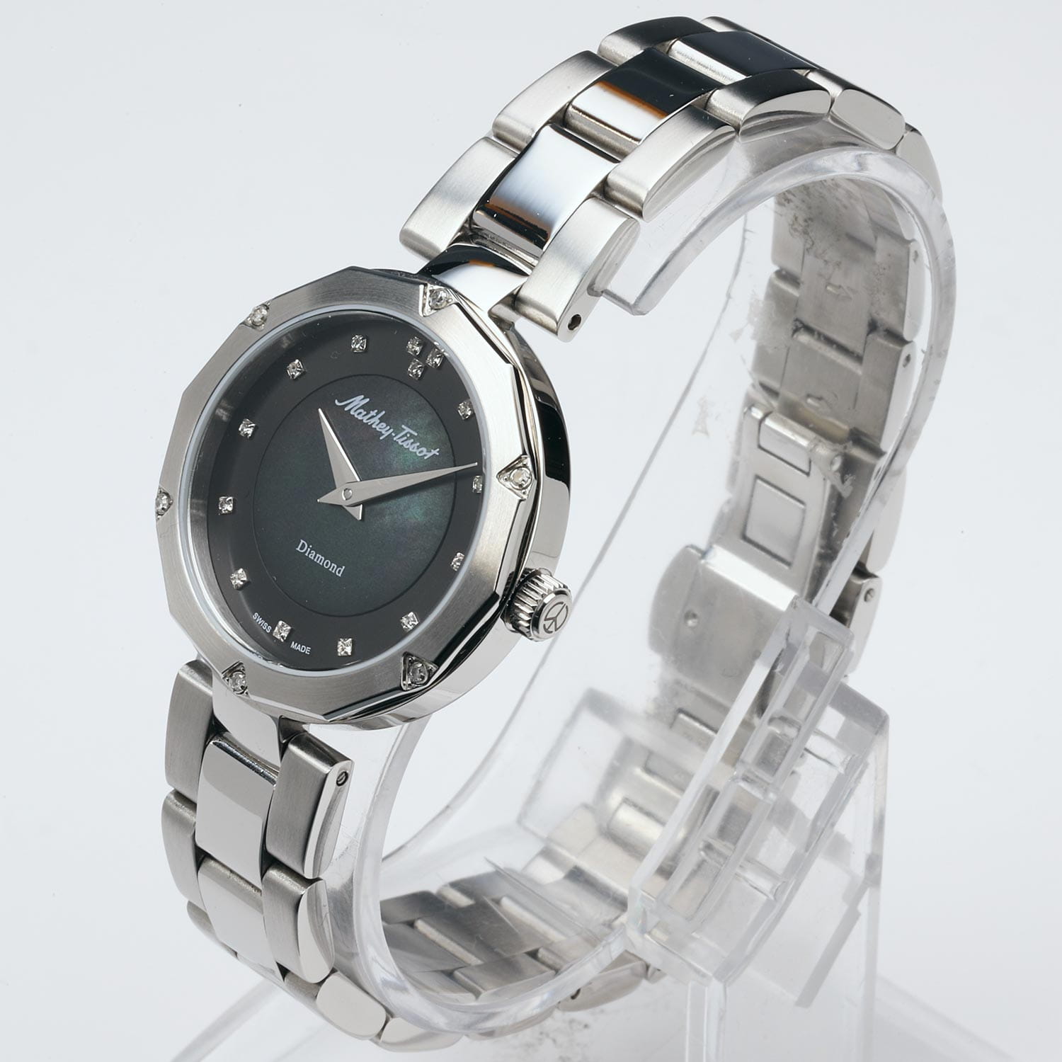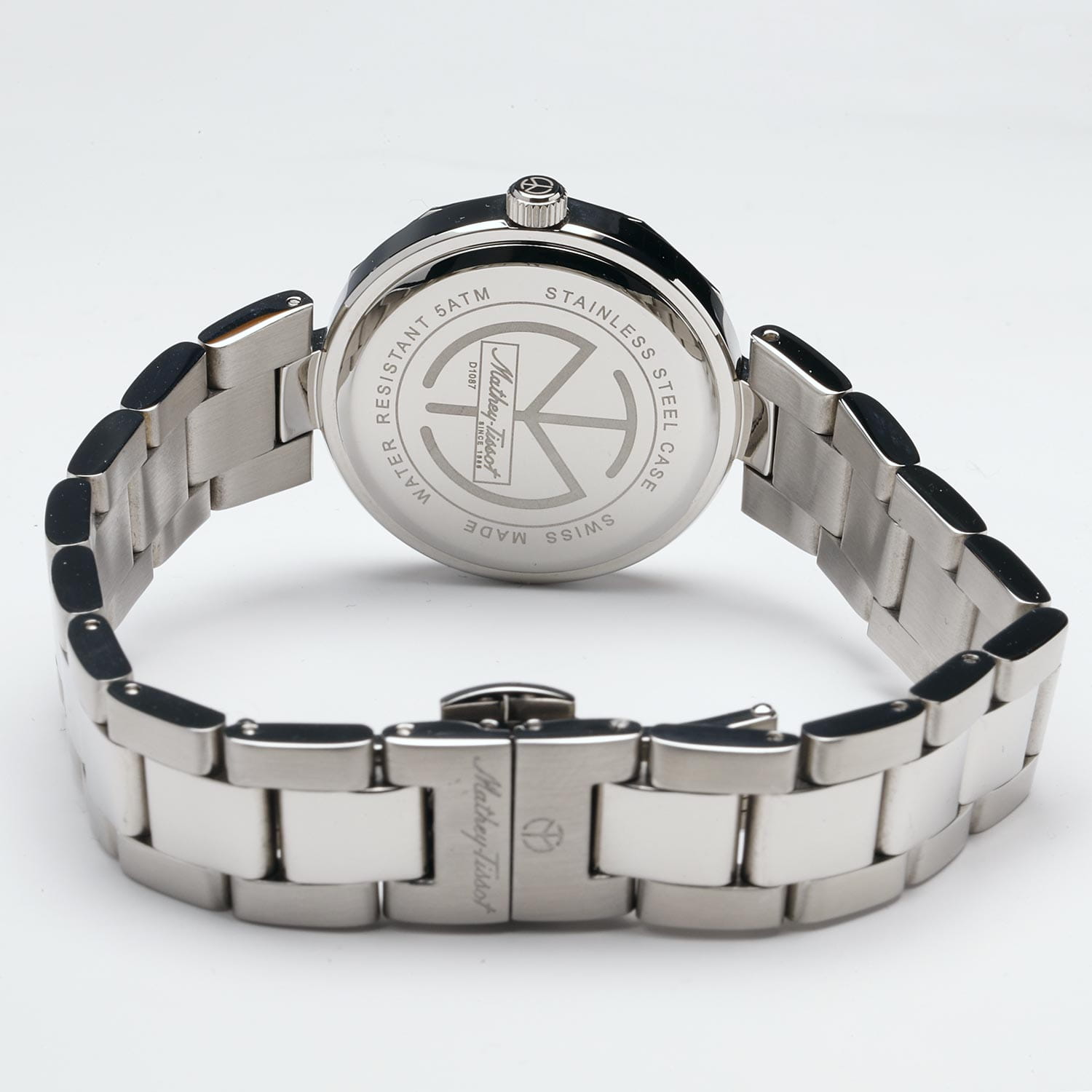 Женские кварцевые часы Mathey-Tissot Molly D1087AQN — это стильное сочетание элегантности и современного дизайна. Изящный корпус выполнен из нержавеющей стали серебристого цвета, диаметром 32 мм, что придаст образу элегантности и надежности. БезельБезельВнешний ободок, закрепляющий стекло. В спортивных часах так называется поворотное кольцо с делениями на циферблате, выполняет роль таймера – замеряет отрезки времени на шкале. Неподвижный безель – элемент декора. Однонаправленно вращающийся безель на дайверских часах позволяет фиксировать моменты погружения и выныривания на поверхность. и циферблат украшены кристаллами. Изысканный циферблат с метками в виде точек придает модели особый блеск. Циферблат защищен минеральным стекломМинеральное стеклоМинеральное стекло представляет собой искусственно выращенный минерал кварца. Такое стекло отличается особой устойчивостью к повреждениям и царапинам. Уступает по некоторым качествам сапфировому стеклу. с сапфировым покрытием, обеспечивает устойчивость к царапинам. Часы оснащены надежным кварцевым механизмом. Стальной браслет на застёжке-бабочке с кнопкамиЗастёжка "бабочка"Такой вид застёжки дополняется предохранителями, помогающими избежать случайного раскрытия браслета. Обладают изящным исполнением. , гарантирует комфортное и безопасное ношение. Класс водозащиты: 50 метров позволит защитить корпус от случайных брызг или капель дождя. Mathey-Tissot  — отличный выбор для тех, кто ценит утонченность и качество.