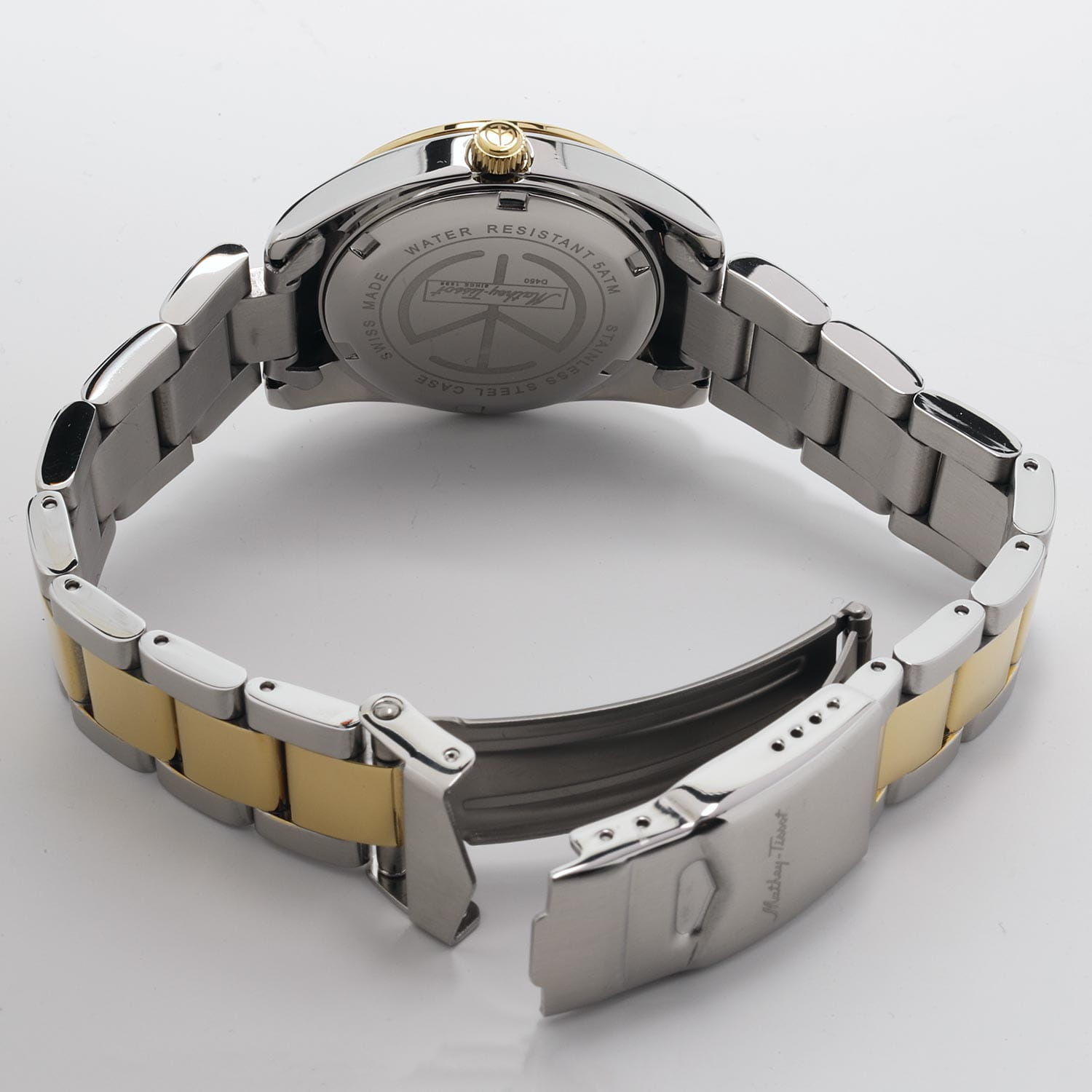 Женские кварцевые часы Mathey-Tissot Mathy D450BN — это стильное сочетание элегантности и современного дизайна. Изящный корпус выполнен из нержавеющей стали, диаметром 30 мм, что придаст образу женственности и романтизма. Изысканный циферблат с метками в виде штрихов придает модели особый блеск. Циферблат защищен минеральным стекломМинеральное стеклоМинеральное стекло представляет собой искусственно выращенный минерал кварца. Такое стекло отличается особой устойчивостью к повреждениям и царапинам. Уступает по некоторым качествам сапфировому стеклу., обеспечивающий устойчивость к царапинам. Стрелки и метки с люминесцентным покрытиемЛюминесцентное покрытиеПозволяет считывать показания времени в темноте. Производители наносят на стрелки, часовые индексы, безель или поверхность циферблата светонакопительный состав, дающий холодное свечение.. БезельБезельВнешний ободок, закрепляющий стекло. В спортивных часах так называется поворотное кольцо с делениями на циферблате, выполняет роль таймера – замеряет отрезки времени на шкале. Неподвижный безель – элемент декора. Однонаправленно вращающийся безель на дайверских часах позволяет фиксировать моменты погружения и выныривания на поверхность. с PVD-покрытиемPVDУльтратонкое покрытие наносится в технике вакуумного напыления, сочетает в себе нитрид титана особой прочности со слоем золота или оксида хрома. Несёт в себе декоративную или защитную функцию. золотистого цвета. Окошко даты находится в положении 3 часа. Часы оснащены надежным кварцевым механизмом. Стальной браслет с частичным PVD-покрытиемPVDУльтратонкое покрытие наносится в технике вакуумного напыления, сочетает в себе нитрид титана особой прочности со слоем золота или оксида хрома. Несёт в себе декоративную или защитную функцию. на раскладной застёжке с фиксаторомРаскладная застёжкаТакой тип застёжки используется только на браслетах из металла. Она никогда не раскрывается полностью, происходит разделение на 2 и более частей. Раскладывающая застёжка снизит вероятность потери часов к минимуму., гарантирует комфортное и безопасное ношение. Класс водозащиты: 50 метров позволит защитить корпус от случайных брызг или капель дождя. Mathey-Tissot  — отличный выбор для тех, кто ценит утонченность и качество.