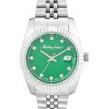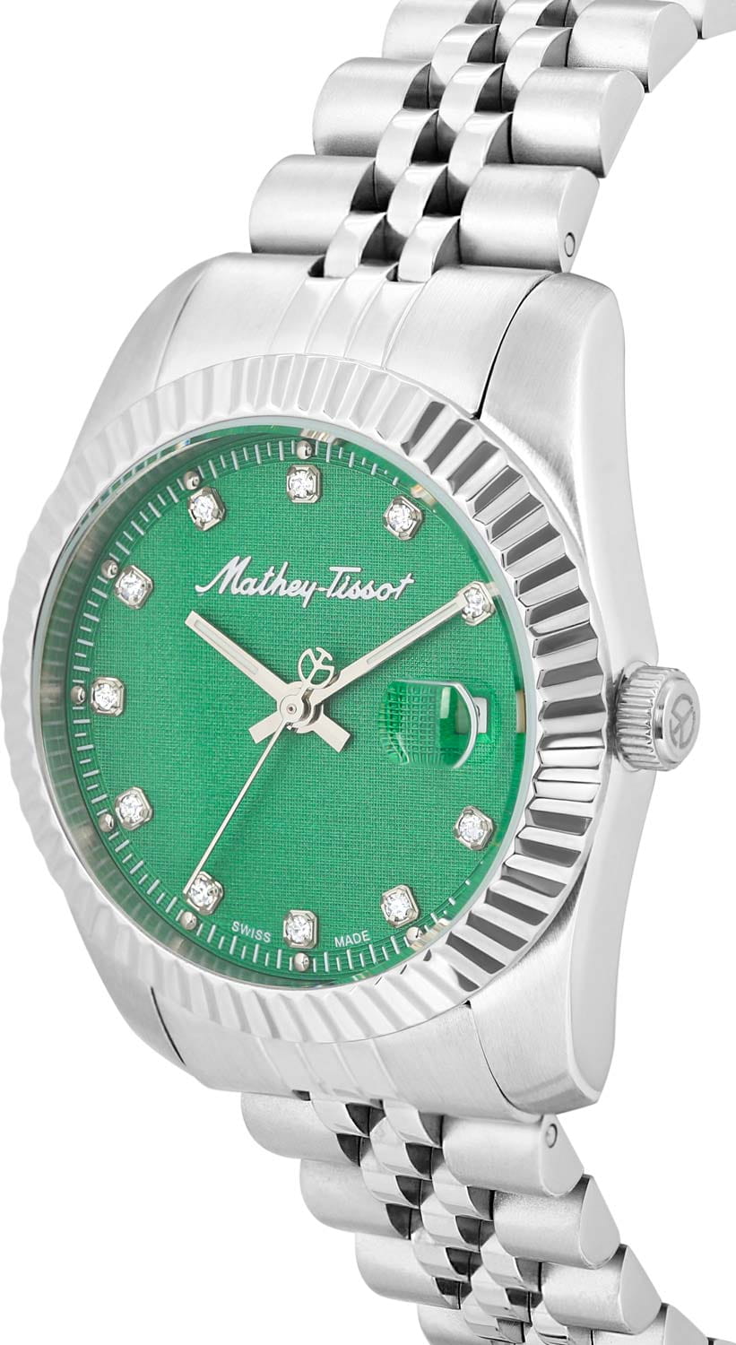 Женские кварцевые часы Mathey-Tissot Mathy D810AV — это стильное сочетание элегантности и современного дизайна. Изящный корпус выполнен из нержавеющей стали, диаметром 32 мм, что придаст образу женственности и романтизма. Изысканный циферблат с метками в виде точек украшены цирконами, что придает модели особый блеск. Циферблат защищен минеральным стекломМинеральное стеклоМинеральное стекло представляет собой искусственно выращенный минерал кварца. Такое стекло отличается особой устойчивостью к повреждениям и царапинам. Уступает по некоторым качествам сапфировому стеклу., обеспечивающий устойчивость к царапинам. Стрелки с люминесцентным покрытиемЛюминесцентное покрытиеПозволяет считывать показания времени в темноте. Производители наносят на стрелки, часовые индексы, безель или поверхность циферблата светонакопительный состав, дающий холодное свечение.. Окошко даты находится в положении 3 часа. Часы оснащены надежным кварцевым механизмом. Стальной браслет на раскладной застёжкеРаскладная застёжкаТакой тип застёжки используется только на браслетах из металла. Она никогда не раскрывается полностью, происходит разделение на 2 и более частей. Раскладывающая застёжка снизит вероятность потери часов к минимуму., гарантирует комфортное и безопасное ношение. Класс водозащиты: 50 метров позволит защитить корпус от случайных брызг или капель дождя. Mathey-Tissot  — отличный выбор для тех, кто ценит утонченность и качество.