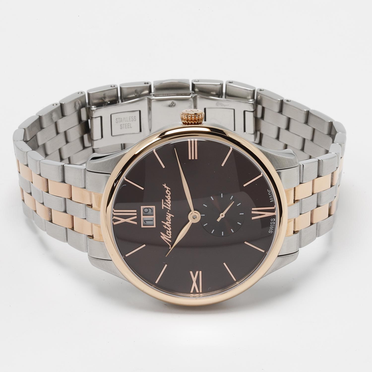Мужские кварцевые часы Mathey-Tissot Edmond Metal H1886MRM — это стильное сочетание элегантности и современного дизайна. Изящный корпус выполнен из нержавеющей стали, диаметром 42 мм, что придаст образу элегантности и надежности. БезельБезельВнешний ободок, закрепляющий стекло. В спортивных часах так называется поворотное кольцо с делениями на циферблате, выполняет роль таймера – замеряет отрезки времени на шкале. Неподвижный безель – элемент декора. Однонаправленно вращающийся безель на дайверских часах позволяет фиксировать моменты погружения и выныривания на поверхность. с PVD-покрытиемPVDУльтратонкое покрытие наносится в технике вакуумного напыления, сочетает в себе нитрид титана особой прочности со слоем золота или оксида хрома. Несёт в себе декоративную или защитную функцию.. Изысканный циферблат с метками в виде штрихов и римских цифр придает модели особый блеск. Циферблат защищен минеральным стекломМинеральное стеклоМинеральное стекло представляет собой искусственно выращенный минерал кварца. Такое стекло отличается особой устойчивостью к повреждениям и царапинам. Уступает по некоторым качествам сапфировому стеклу. с сапфировым покрытием, обеспечивает устойчивость к царапинам. Окошко даты находится в положении 12 часов. Стальной браслет с частичным PVD-покрытиемPVDУльтратонкое покрытие наносится в технике вакуумного напыления, сочетает в себе нитрид титана особой прочности со слоем золота или оксида хрома. Несёт в себе декоративную или защитную функцию. на застёжке-бабочке с кнопкамиЗастёжка "бабочка"Такой вид застёжки дополняется предохранителями, помогающими избежать случайного раскрытия браслета. Обладают изящным исполнением. , гарантирует комфортное и безопасное ношение. Секундная стрелка вынесена на отдельный циферблат. Рифленая заводная головка. Класс водозащиты: 50 метров позволит защитить корпус от случайных брызг или капель дождя. Mathey-Tissot — отличный выбор для тех, кто ценит утонченность и качество.