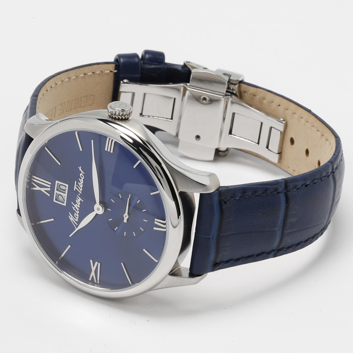 Мужские кварцевые часы Mathey-Tissot Edmond Quartz H1886QABU — это стильное сочетание элегантности и современного дизайна. Изящный корпус выполнен из нержавеющей стали, диаметром 42 мм, что придаст образу элегантности и надежности. Изысканный циферблат с метками в виде штрихов и римских цифр придает модели особый блеск. Циферблат защищен минеральным стекломМинеральное стеклоМинеральное стекло представляет собой искусственно выращенный минерал кварца. Такое стекло отличается особой устойчивостью к повреждениям и царапинам. Уступает по некоторым качествам сапфировому стеклу. с сапфировым покрытием, обеспечивает устойчивость к царапинам. Окошко даты находится в положении 12 часов. Кожаный ремешок с тиснением под кожу аллигатора на застёжке-бабочке с кнопкамиЗастёжка "бабочка"Такой вид застёжки дополняется предохранителями, помогающими избежать случайного раскрытия браслета. Обладают изящным исполнением. , гарантирует комфортное и безопасное ношение. Секундная стрелка вынесена на отдельный циферблат. Рифленая заводная головка. Класс водозащиты: 50 метров позволит защитить корпус от случайных брызг или капель дождя. Mathey-Tissot — отличный выбор для тех, кто ценит утонченность и качество.