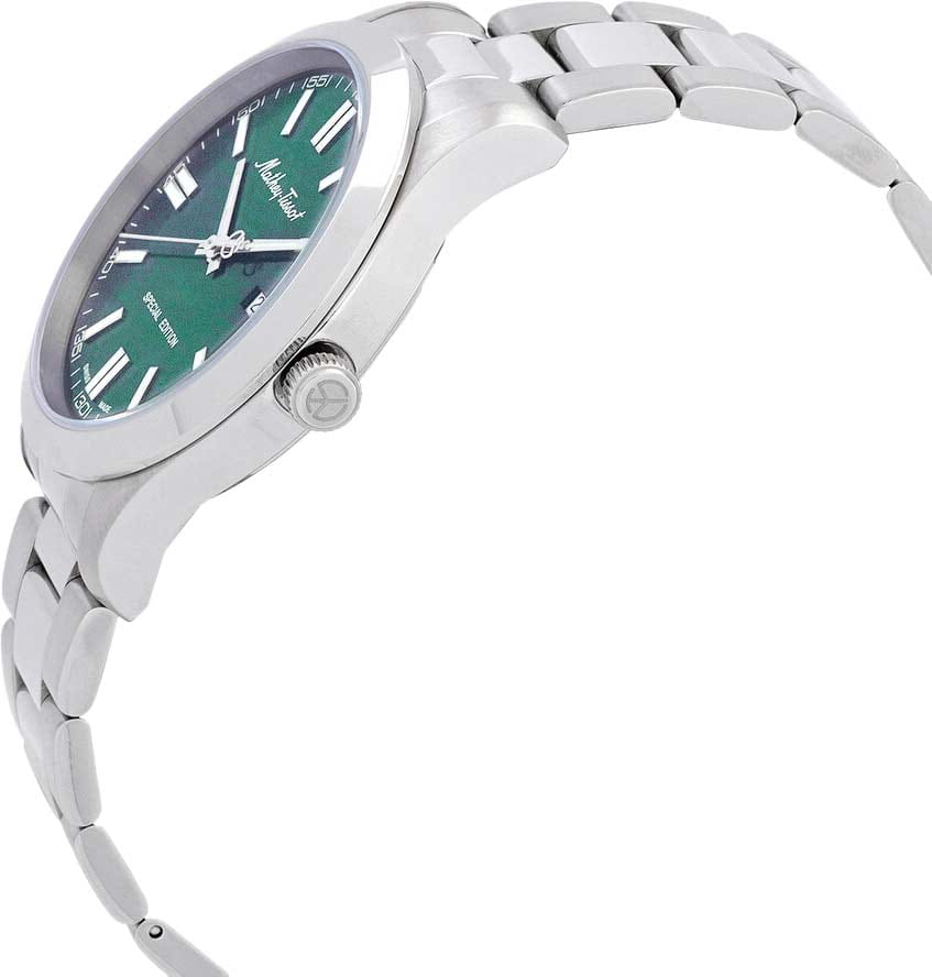 Мужские кварцевые часы Mathey-Tissot Mathy H455VE — это стильное сочетание элегантности и современного дизайна. Изящный корпус выполнен из нержавеющей стали, диаметром 44 мм, что придаст образу элегантности и надежности. Изысканный циферблат с метками в виде штрихов придает модели особый блеск. Циферблат защищен минеральным стекломМинеральное стеклоМинеральное стекло представляет собой искусственно выращенный минерал кварца. Такое стекло отличается особой устойчивостью к повреждениям и царапинам. Уступает по некоторым качествам сапфировому стеклу., обеспечивает устойчивость к царапинам. Стрелки и метки с люминесцентным покрытиемЛюминесцентное покрытиеПозволяет считывать показания времени в темноте. Производители наносят на стрелки, часовые индексы, безель или поверхность циферблата светонакопительный состав, дающий холодное свечение.. Окошко даты находится в положении 3 часа. Часы оснащены надежным кварцевым механизмом. Стальной браслет на раскладной застёжке с фиксаторомРаскладная застёжкаТакой тип застёжки используется только на браслетах из металла. Она никогда не раскрывается полностью, происходит разделение на 2 и более частей. Раскладывающая застёжка снизит вероятность потери часов к минимуму., гарантирует комфортное и безопасное ношение. Рифленая заводная головка. Класс водозащиты: 50 метров, позволит защитить корпус от случайных брызг или капель дождя. Mathey-Tissot — отличный выбор для тех, кто ценит утонченность и качество.