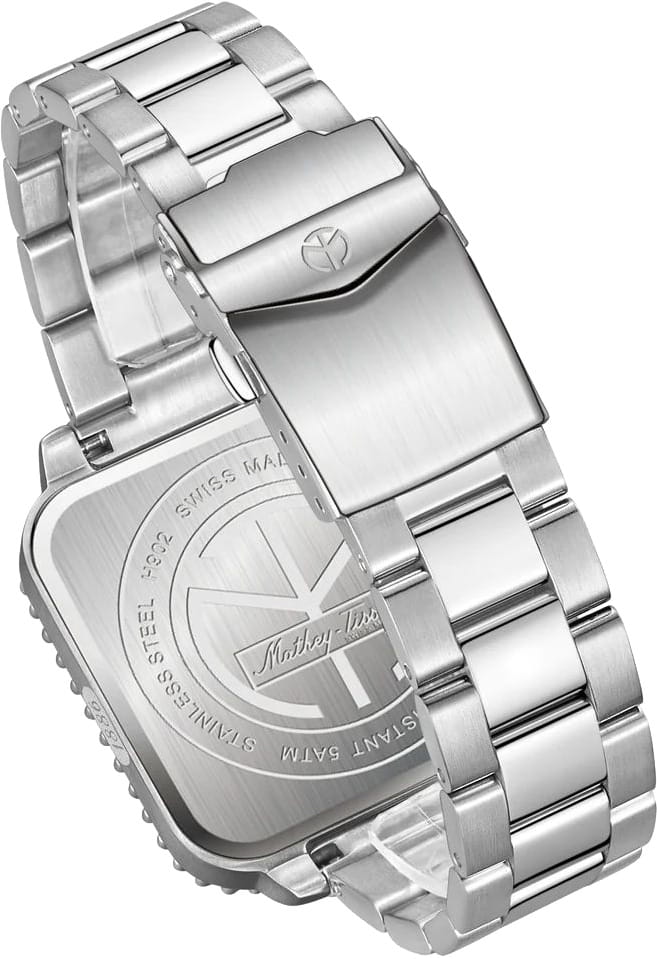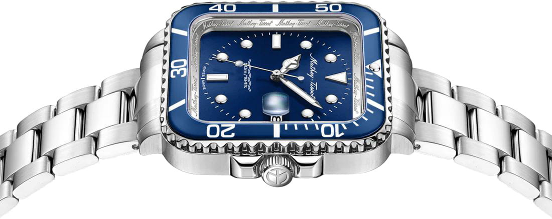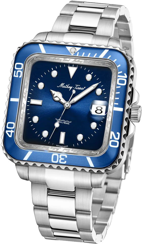 Мужские кварцевые часы Mathey-Tissot Mathy H902QABU — это стильное сочетание элегантности и современного дизайна. Изящный корпус выполнен из нержавеющей стали, диаметром 42 мм, что придаст образу элегантности и надежности. Изысканный циферблат с метками в виде точек придает модели особый блеск. Циферблат защищен сапфировым стекломСапфировое стеклоПрочный и надёжный материал из кристалла сапфира синтетического происхождения, характеризующийся особой твёрдостью и устойчивостью к царапинам и повреждениям., обеспечивает устойчивость к царапинам. Стрелки и метки с люминесцентным покрытиемЛюминесцентное покрытиеПозволяет считывать показания времени в темноте. Производители наносят на стрелки, часовые индексы, безель или поверхность циферблата светонакопительный состав, дающий холодное свечение. SuperLumiNova, которое светится в темноте после непродолжительной зарядки на свету. БезельБезельВнешний ободок, закрепляющий стекло. В спортивных часах так называется поворотное кольцо с делениями на циферблате, выполняет роль таймера – замеряет отрезки времени на шкале. Неподвижный безель – элемент декора. Однонаправленно вращающийся безель на дайверских часах позволяет фиксировать моменты погружения и выныривания на поверхность. с PVD-покрытиемPVDУльтратонкое покрытие наносится в технике вакуумного напыления, сочетает в себе нитрид титана особой прочности со слоем золота или оксида хрома. Несёт в себе декоративную или защитную функцию. синего цвета. Окошко даты находится в положении 3 часа. Стальной браслет на раскладной застёжке с фиксаторомРаскладная застёжкаТакой тип застёжки используется только на браслетах из металла. Она никогда не раскрывается полностью, происходит разделение на 2 и более частей. Раскладывающая застёжка снизит вероятность потери часов к минимуму., гарантирует комфортное и безопасное ношение. Рифленая заводная головка. Класс водозащиты: 50 метров позволит защитить корпус от случайных брызг или капель дождя. Mathey-Tissot  — отличный выбор для тех, кто ценит утонченность и качество.