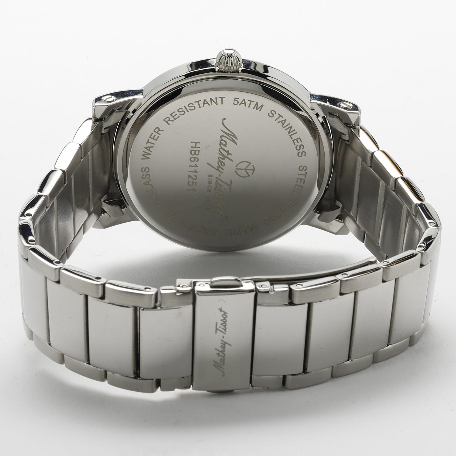 Мужские кварцевые часы Mathey-Tissot City Metal HB611251MAM — это стильное сочетание элегантности и современного дизайна. Изящный корпус выполнен из нержавеющей стали 316L серебристого цвета, диаметром 42 мм, что придаст образу элегантности и надежности. Изысканный циферблат с метками в виде штрихов придает модели особый блеск. Циферблат защищен минеральным стекломМинеральное стеклоМинеральное стекло представляет собой искусственно выращенный минерал кварца. Такое стекло отличается особой устойчивостью к повреждениям и царапинам. Уступает по некоторым качествам сапфировому стеклу. с сапфировым покрытием, обеспечивающий устойчивость к царапинам. Окошко даты находится в положении 3 часа. Часы оснащены надежным кварцевым механизмом. Стальной браслет на раскладной застёжкеРаскладная застёжкаТакой тип застёжки используется только на браслетах из металла. Она никогда не раскрывается полностью, происходит разделение на 2 и более частей. Раскладывающая застёжка снизит вероятность потери часов к минимуму., гарантирует комфортное и безопасное ношение. Класс водозащиты: 30 метров позволит защитить корпус от случайных брызг или капель дождя. Mathey-Tissot  — отличный выбор для тех, кто ценит утонченность и качество.