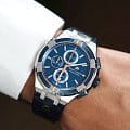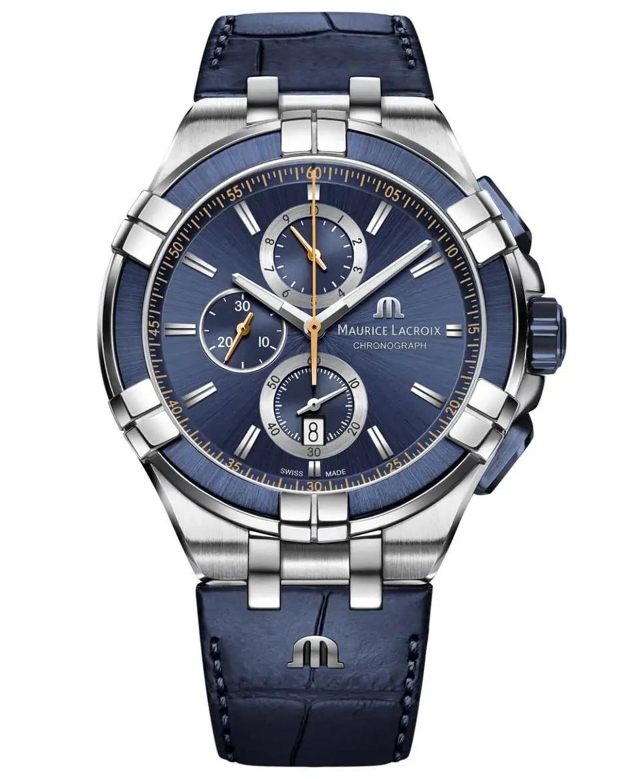 Мужские швейцарские кварцевые часы-хронографХронографФункция позволяет измерять отрезки времени с особой точностью: часы, минуты, секунды. Верным признаком хронографа является наличие на циферблате 3 дополнительных окошек-счётчиков. Maurice Lacroix Aikon Chronograph AI1018-SS001-432-4. Сапфировое стеклоСапфировое стеклоПрочный и надёжный материал из кристалла сапфира синтетического происхождения, характеризующийся особой твёрдостью и устойчивостью к царапинам и повреждениям. устойчивое к появлению царапин, обладающее высокой прозрачностью. Циферблат выполнен по технологии Sunray (солнечные лучи). Стрелки с люминесцентным покрытиемЛюминесцентное покрытиеПозволяет считывать показания времени в темноте. Производители наносят на стрелки, часовые индексы, безель или поверхность циферблата светонакопительный состав, дающий холодное свечение.. Класс водозащиты: 100 метров, позволит плавать, нырять и заниматься другими водными видами спорта. Окошко даты находится в положении 6 часов. Корпус часов изготовлен из стали с PVD-покрытиемPVDУльтратонкое покрытие наносится в технике вакуумного напыления, сочетает в себе нитрид титана особой прочности со слоем золота или оксида хрома. Несёт в себе декоративную или защитную функцию.. Кожаный ремешок с застёжкой «бабочка» с кнопкамиЗастёжка "бабочка"Такой вид застёжки дополняется предохранителями, помогающими избежать случайного раскрытия браслета. Обладают изящным исполнением. .
