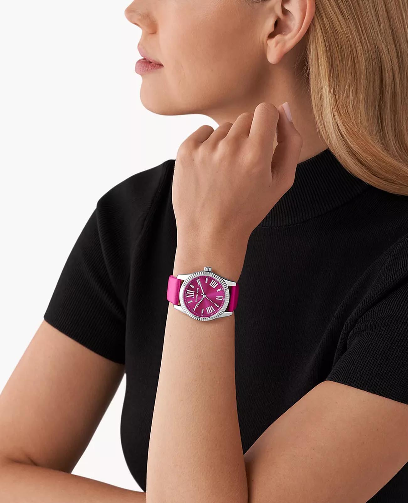 Женские американские часы с минеральным стекломМинеральное стеклоМинеральное стекло представляет собой искусственно выращенный минерал кварца. Такое стекло отличается особой устойчивостью к повреждениям и царапинам. Уступает по некоторым качествам сапфировому стеклу. Michael Kors Lexington MK4749, кварцевый механизм с высокой точностью. Корпус часов изготовлен из нержавеющей стали. БезельБезельВнешний ободок, закрепляющий стекло. В спортивных часах так называется поворотное кольцо с делениями на циферблате, выполняет роль таймера – замеряет отрезки времени на шкале. Неподвижный безель – элемент декора. Однонаправленно вращающийся безель на дайверских часах позволяет фиксировать моменты погружения и выныривания на поверхность. с алмазной гранью. Метки в виде штрихов и римских цифр. Заводная головка с защитой. Класс водозащиты: 100 метров, позволит плавать, нырять и заниматься другими водными видами спорта. Кожаный ремешок на стандартной застёжке.