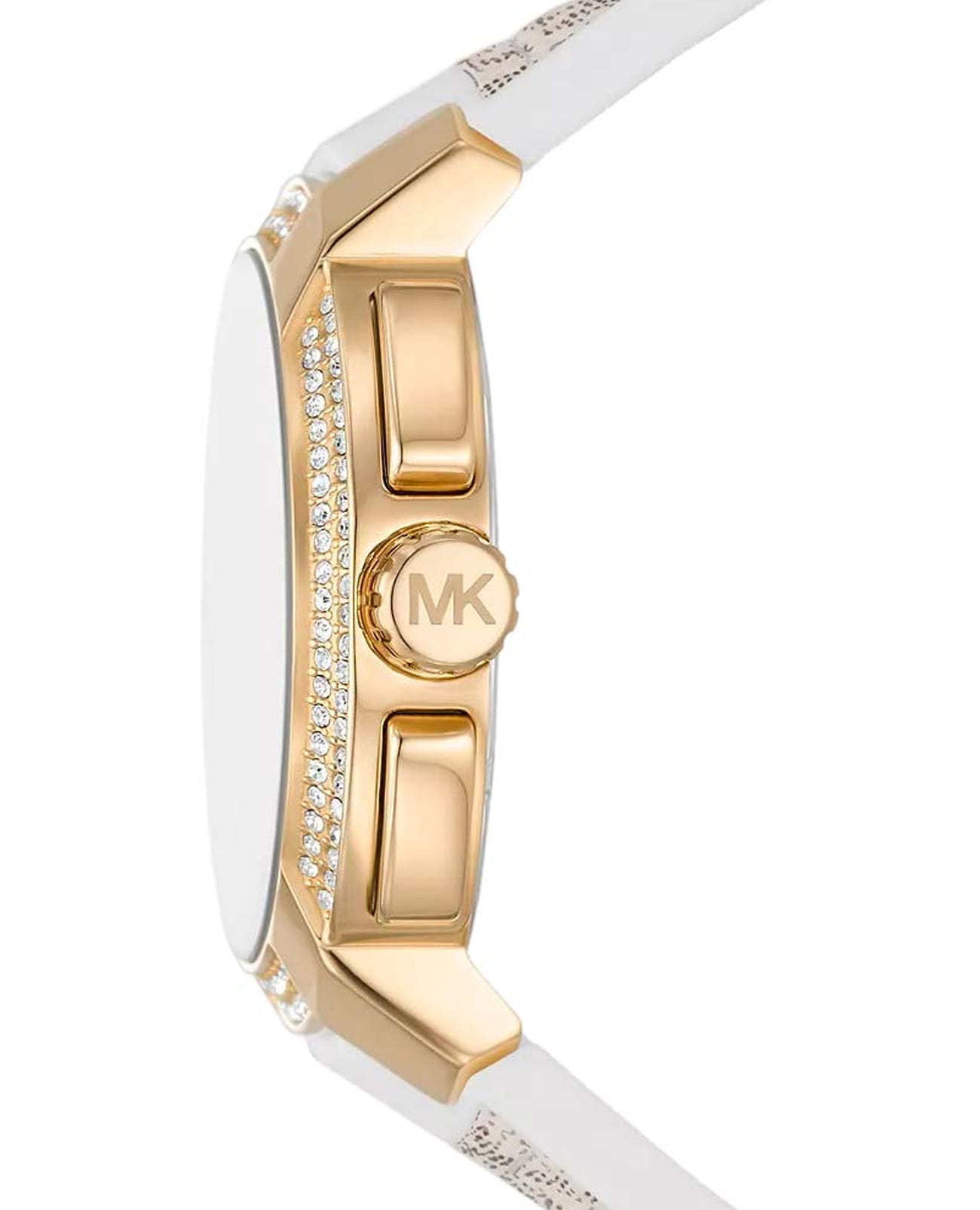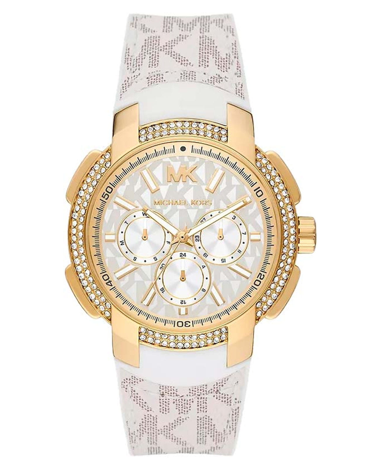 Женские американские часы с минеральным стекломМинеральное стеклоМинеральное стекло представляет собой искусственно выращенный минерал кварца. Такое стекло отличается особой устойчивостью к повреждениям и царапинам. Уступает по некоторым качествам сапфировому стеклу. Michael Kors Sidney MK7221, кварцевый механизм с высокой точностью. Корпус часов изготовлен из нержавеющей стали с PVD-покрытиемPVDУльтратонкое покрытие наносится в технике вакуумного напыления, сочетает в себе нитрид титана особой прочности со слоем золота или оксида хрома. Несёт в себе декоративную или защитную функцию.. БезельБезельВнешний ободок, закрепляющий стекло. В спортивных часах так называется поворотное кольцо с делениями на циферблате, выполняет роль таймера – замеряет отрезки времени на шкале. Неподвижный безель – элемент декора. Однонаправленно вращающийся безель на дайверских часах позволяет фиксировать моменты погружения и выныривания на поверхность. украшен кристаллами. 12-ти и 24-х часовой формат времени, число и день недели отображаются на отдельных циферблатах.  Циферблат с узнаваемым принтом бренда и метками в виде штрихов. Стрелки с люминесцентным покрытиемЛюминесцентное покрытиеПозволяет считывать показания времени в темноте. Производители наносят на стрелки, часовые индексы, безель или поверхность циферблата светонакопительный состав, дающий холодное свечение.. Рифленая заводная головка. Класс водозащиты: 50 метров, позволит защитить корпус от случайных брызг или капель дождя. Ремешок из экокожи на стандартной застежке.
