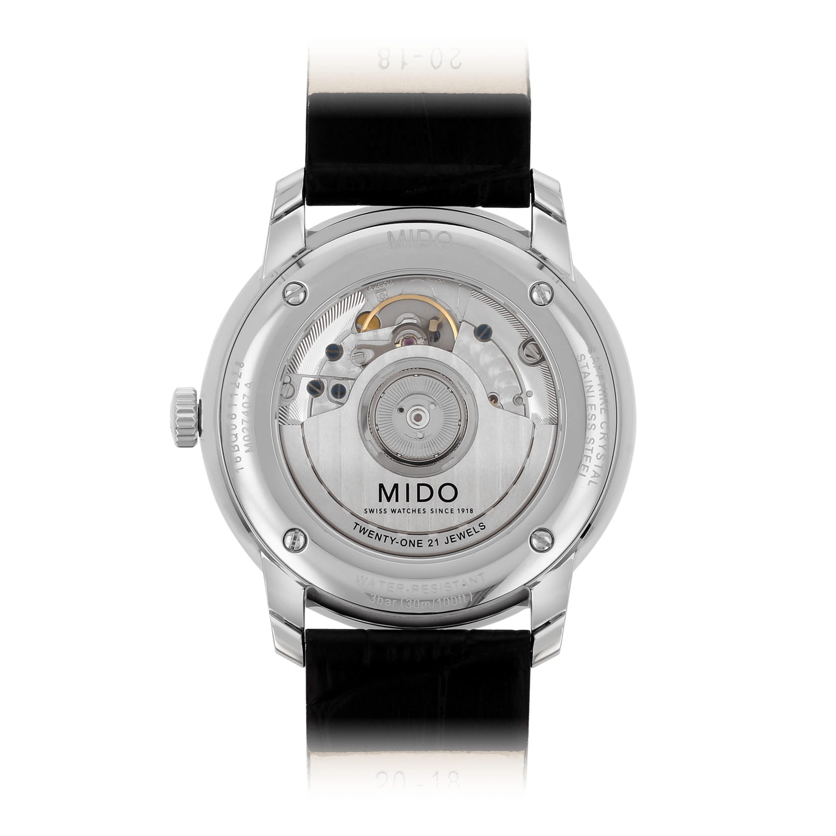 Модель оснащена автоматическим механизмом Mido Caliber 72 с запасом хода до 72 часов, что гарантирует точность и надёжность. Окно даты на отметке 3 часов добавляет удобства в повседневной жизни.