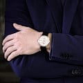 Чёрный кожаный ремешок с классической застёжкой обеспечивает комфортное ношение и надёжную фиксацию. Водозащита до 3 ATM делает часы подходящими для случайных контактов с водой.