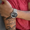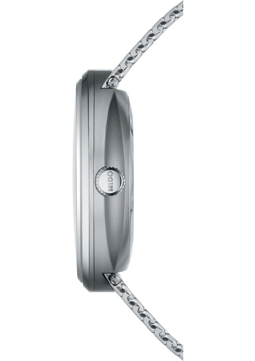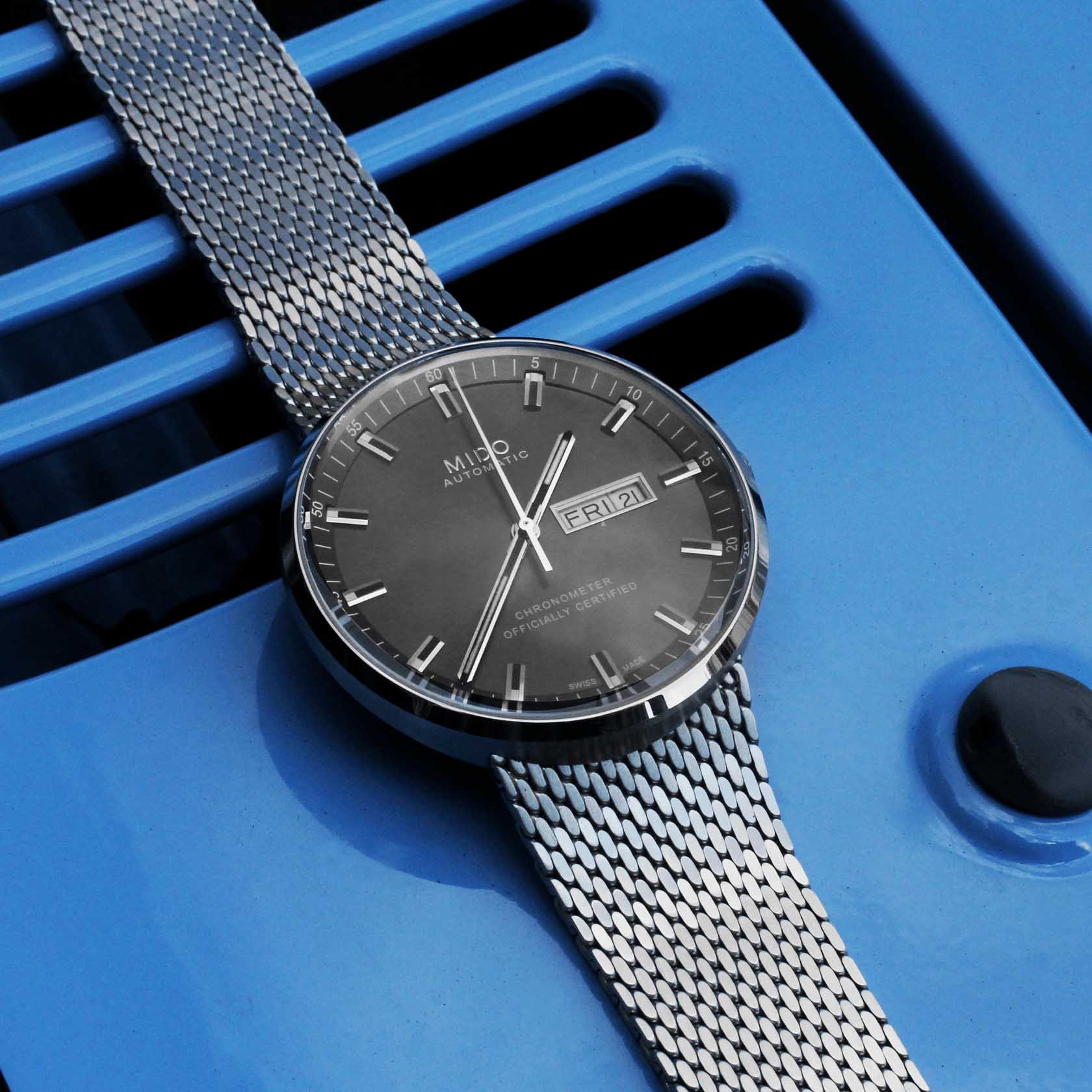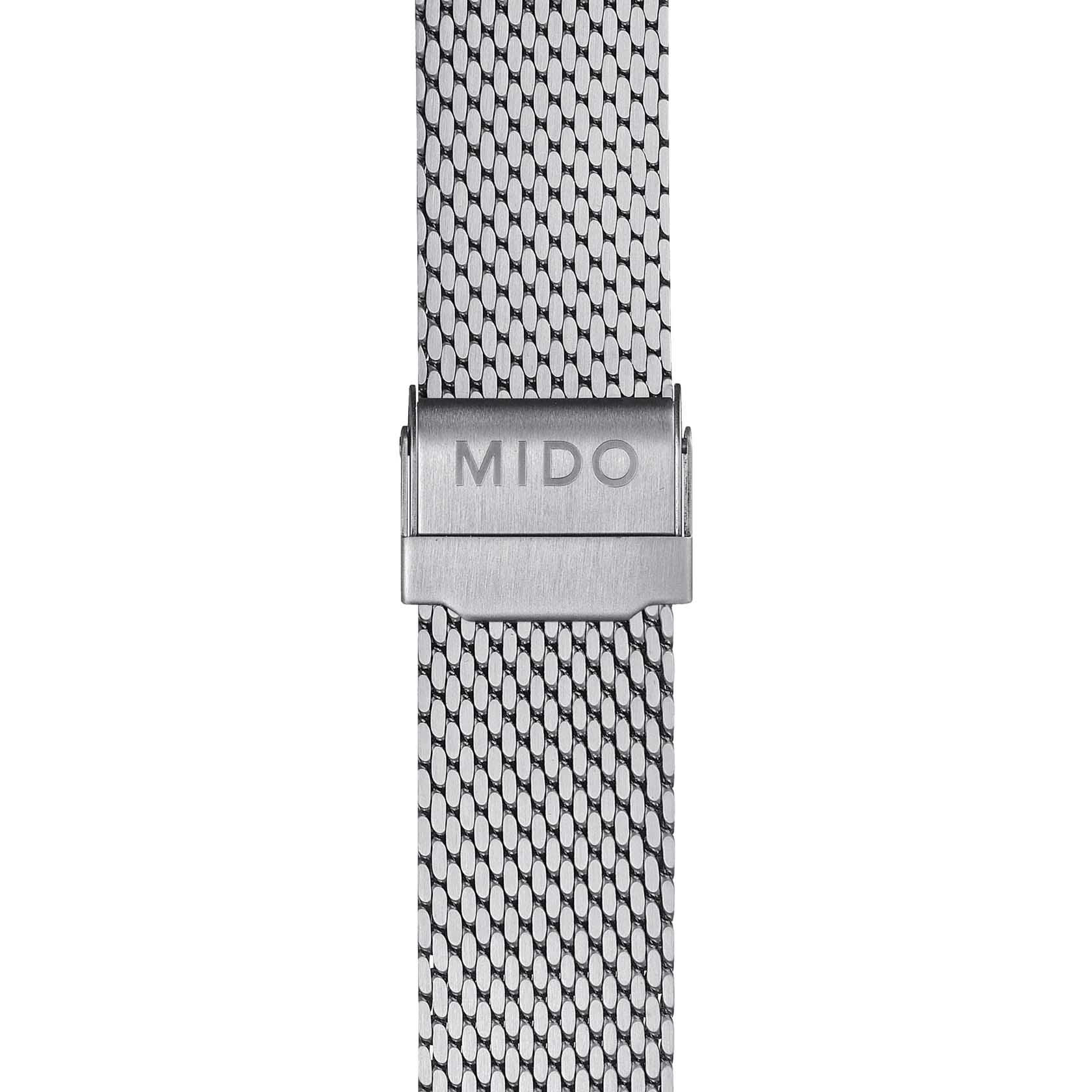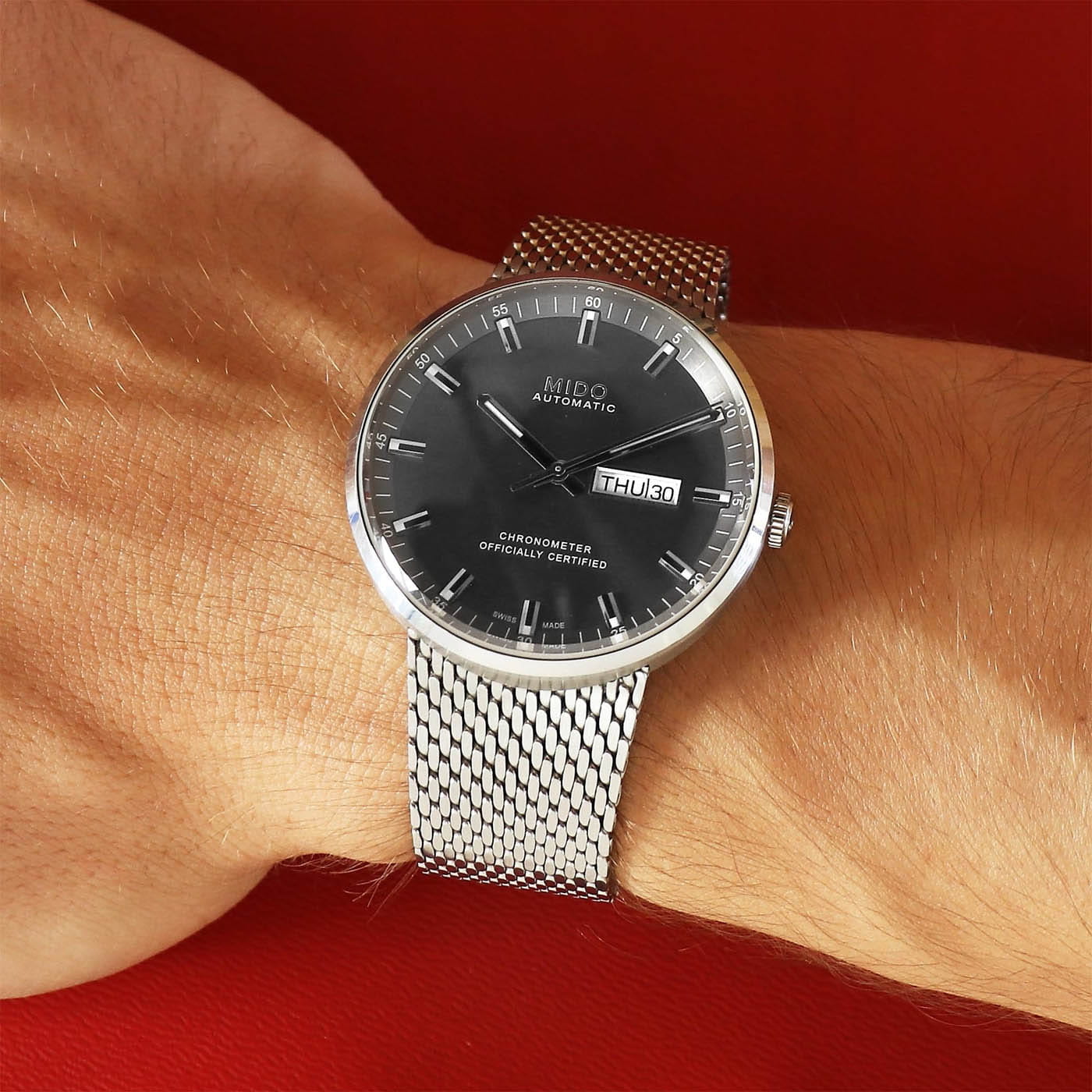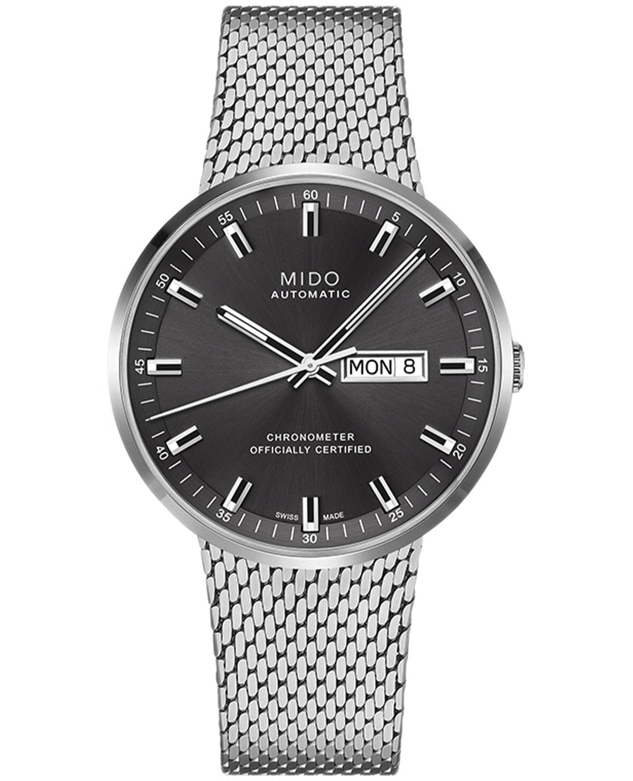 Швейцарские часы Commander Icone отдают дань уважения одной из самых культовых моделей Mido. Мужские швейцарские механические часы с автоподзаводом Mido Commander Icone M031.631.11.061.00, механический механизм (автоматический калибр) с высокой точностью. Сапфировое стеклоСапфировое стеклоПрочный и надёжный материал из кристалла сапфира синтетического происхождения, характеризующийся особой твёрдостью и устойчивостью к царапинам и повреждениям. устойчивое к появлению царапин, обладающее высокой прозрачностью. Класс водозащиты: 50 метров, позволит защитить корпус от случайных брызг или капель дождя. Корпус часов изготовлен из стали. Стальной браслет на раскладной застёжкеРаскладная застёжкаТакой тип застёжки используется только на браслетах из металла. Она никогда не раскрывается полностью, происходит разделение на 2 и более частей. Раскладывающая застёжка снизит вероятность потери часов к минимуму.. Нео-винтажный дизайн вобрал в себя большинство кодов, ответственных за успех Commander: чрезвычайно чистые линии, максимальное пространство, предоставленное превосходному сатинированному циферблату с эффектом солнечных лучей, и браслету с миланским плетением. Модель оснащена COSCСертификат COSCОфициальный сертификат, подтверждающий то, что часы ходят с особо высокой точностью. Для получения документа часы подвергаются тестовым испытаниям, разработанным швейцарским институтом тестирования хронометров COSC. Допустимая норма для механических часов -4/+6 секунд в день, для кварцевых моделей +/- 0,07 секунд в день. сертифицированным автоматическим механизмом Caliber 80 Chronometer Silicon с кремниевой пружиной баланса, обеспечивающим превосходную точность и запас хода до 80 часов. Стрелки и метки с люминесцентным покрытиемЛюминесцентное покрытиеПозволяет считывать показания времени в темноте. Производители наносят на стрелки, часовые индексы, безель или поверхность циферблата светонакопительный состав, дающий холодное свечение.. Окошки дня недели и даты находятся в положении 3 часа.